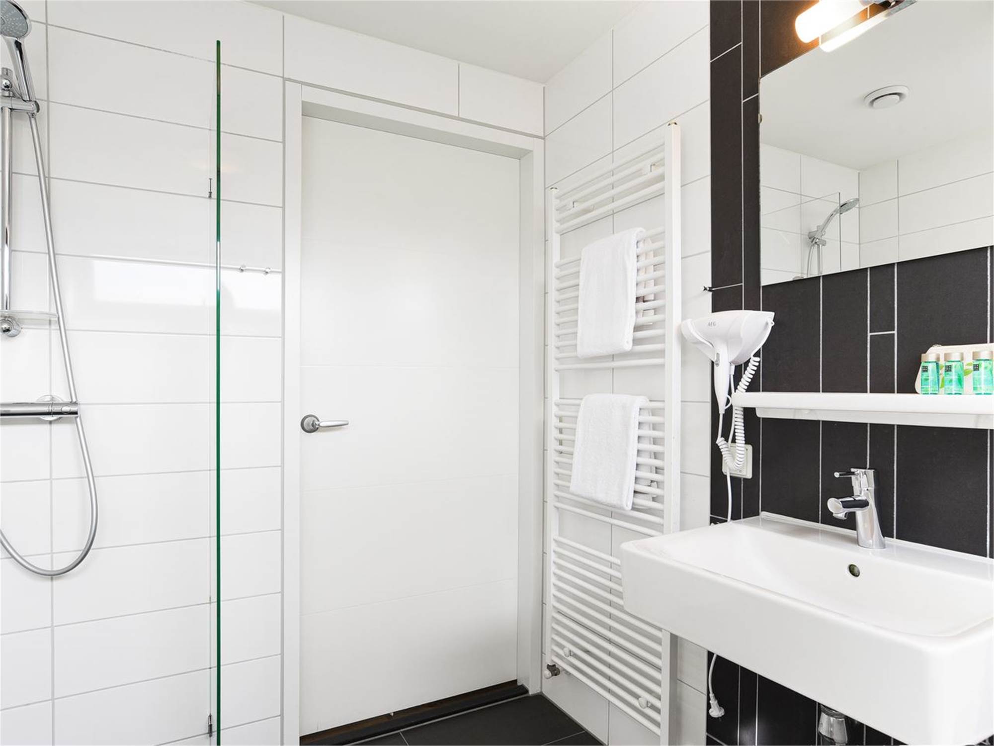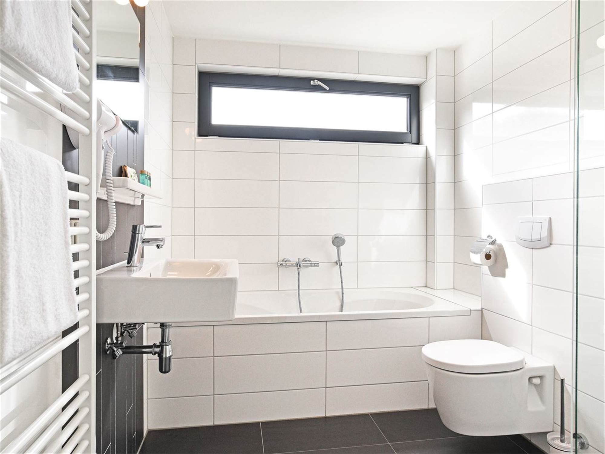 Two bathrooms with bathtub, shower cubicle, washbasin and toilet