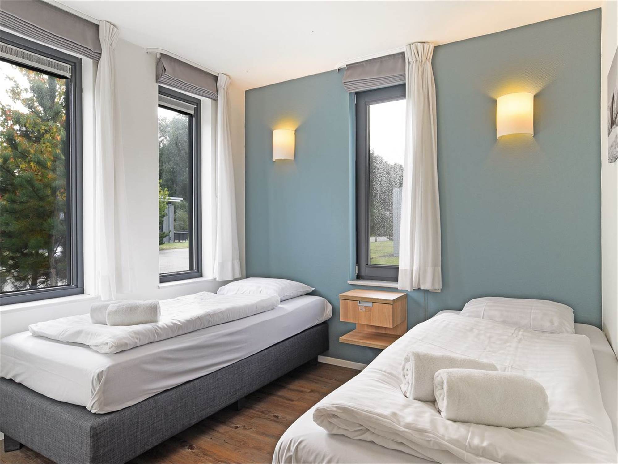 Three bedrooms with two single box spring beds