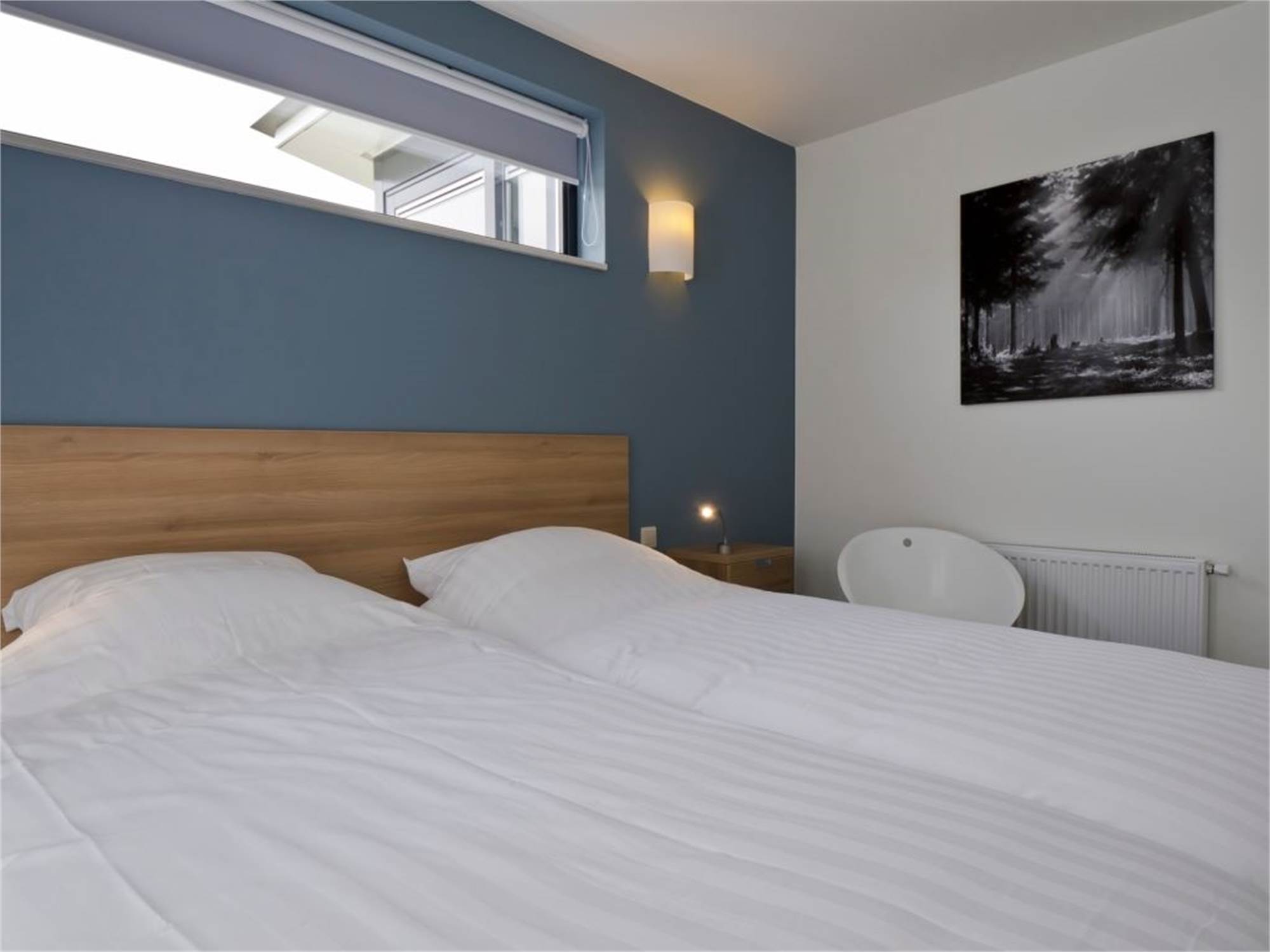 Bedroom with two single box spring beds, 2 person soft mattress topper and flatscreen TV