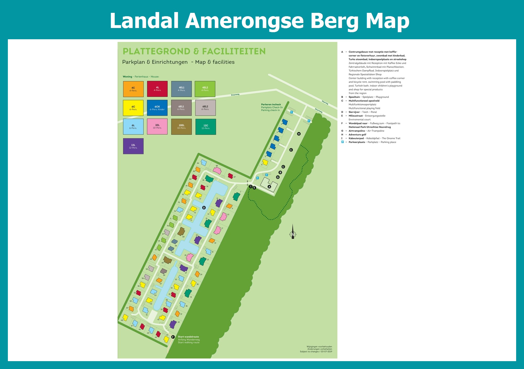 Up-to-date and comprehensive village map of Landal Amerongse Berg with all accommodations and facilities, also available as PDF.