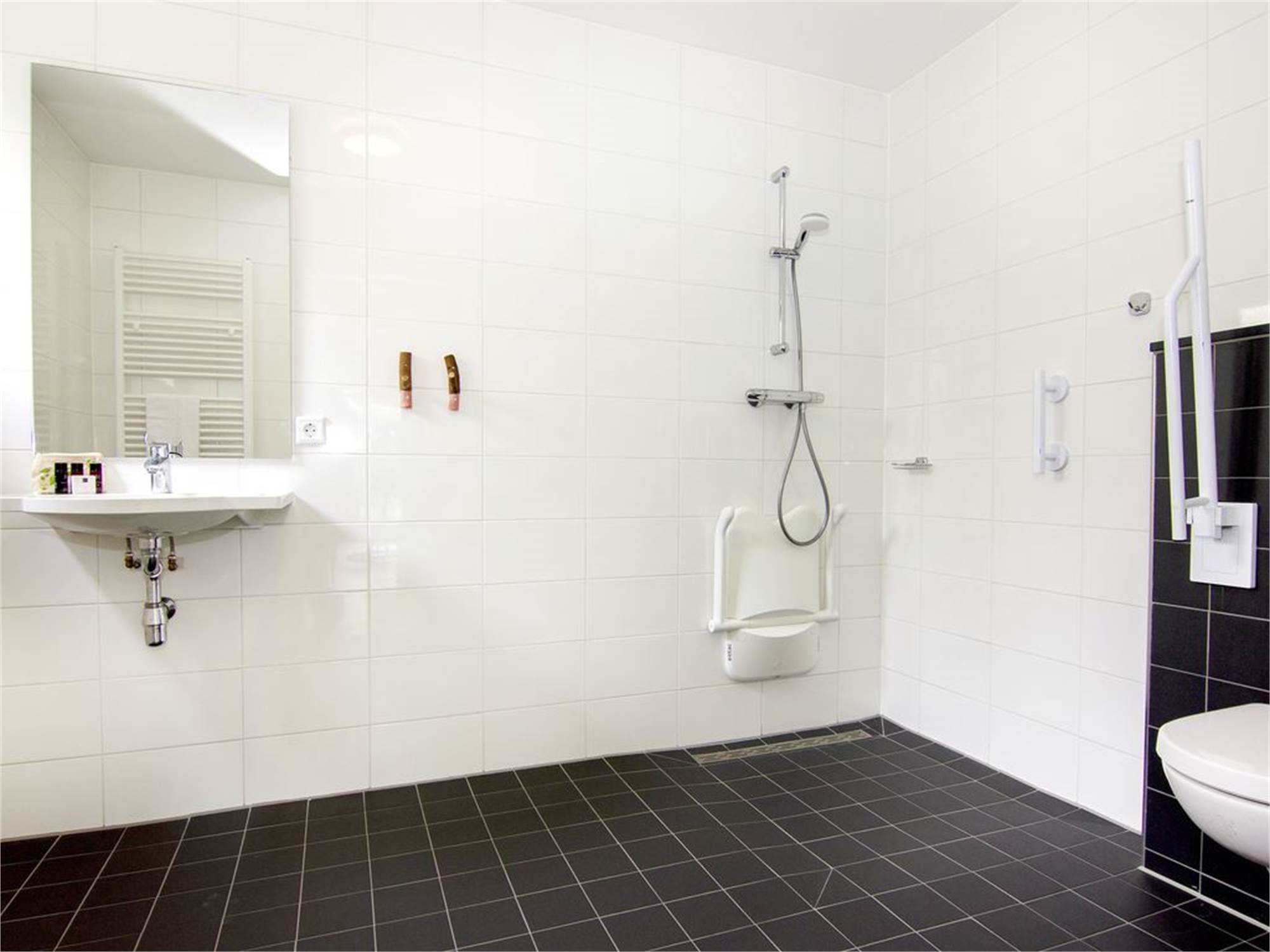 Adapted bathroom with shower cubicle with grab rails, fixed shower seat, raised toilet with grab rails, washbasin a minimum of 78 cm high, wheelchair-friendly and with single lever mixer taps, mirror, turning circle a minimum of 150 cm