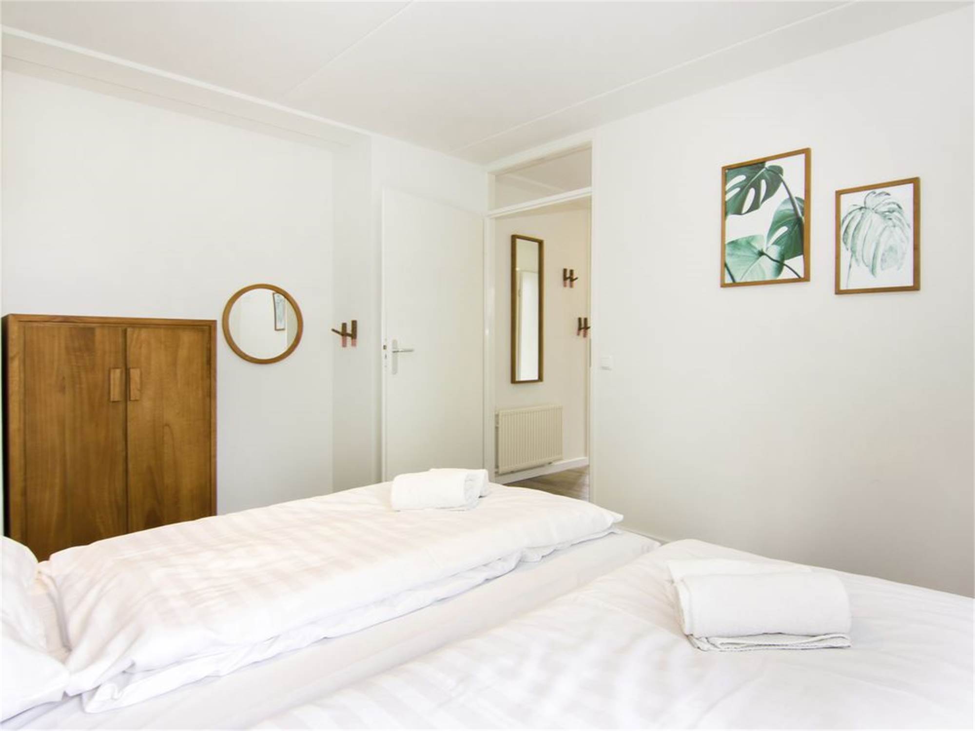 Adapted bedroom with two single box spring beds, room to accommodate one high-low bed and space next to the bed a minimum of 90 cm and turning circle a minimum of 150 cm