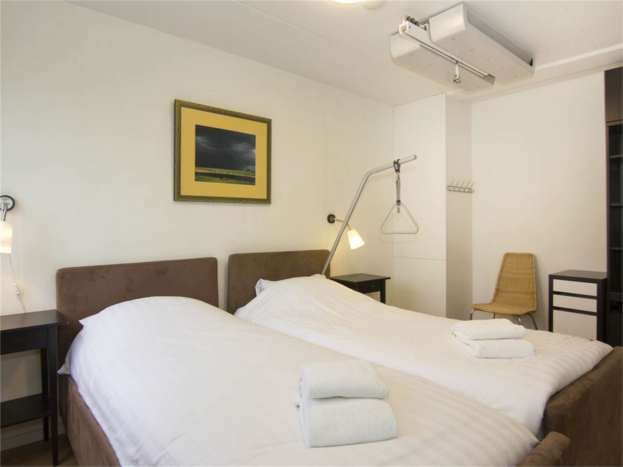 Adapted bedroom with single box spring bed, a high-low bed with monkey pole, siderail and fixed patient lift