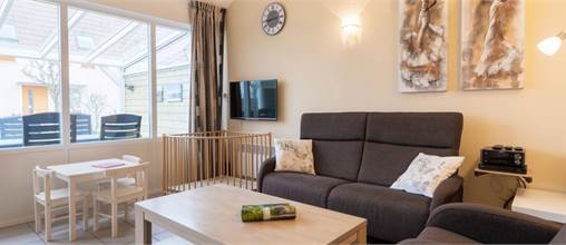 This children's bungalow sleeps four adults and one baby. There is a living room with a dining area and an open plan kitchen with a dishwasher. Downstairs are a bedroom with box-spring beds, one bathroom with shower and another separate toilet. Upstairs are two additional bedrooms, one with two box-spring beds and one with a child's cot. The bungalow boasts a garden including a terrace with garden furniture and Wi-Fi is available free of charge.