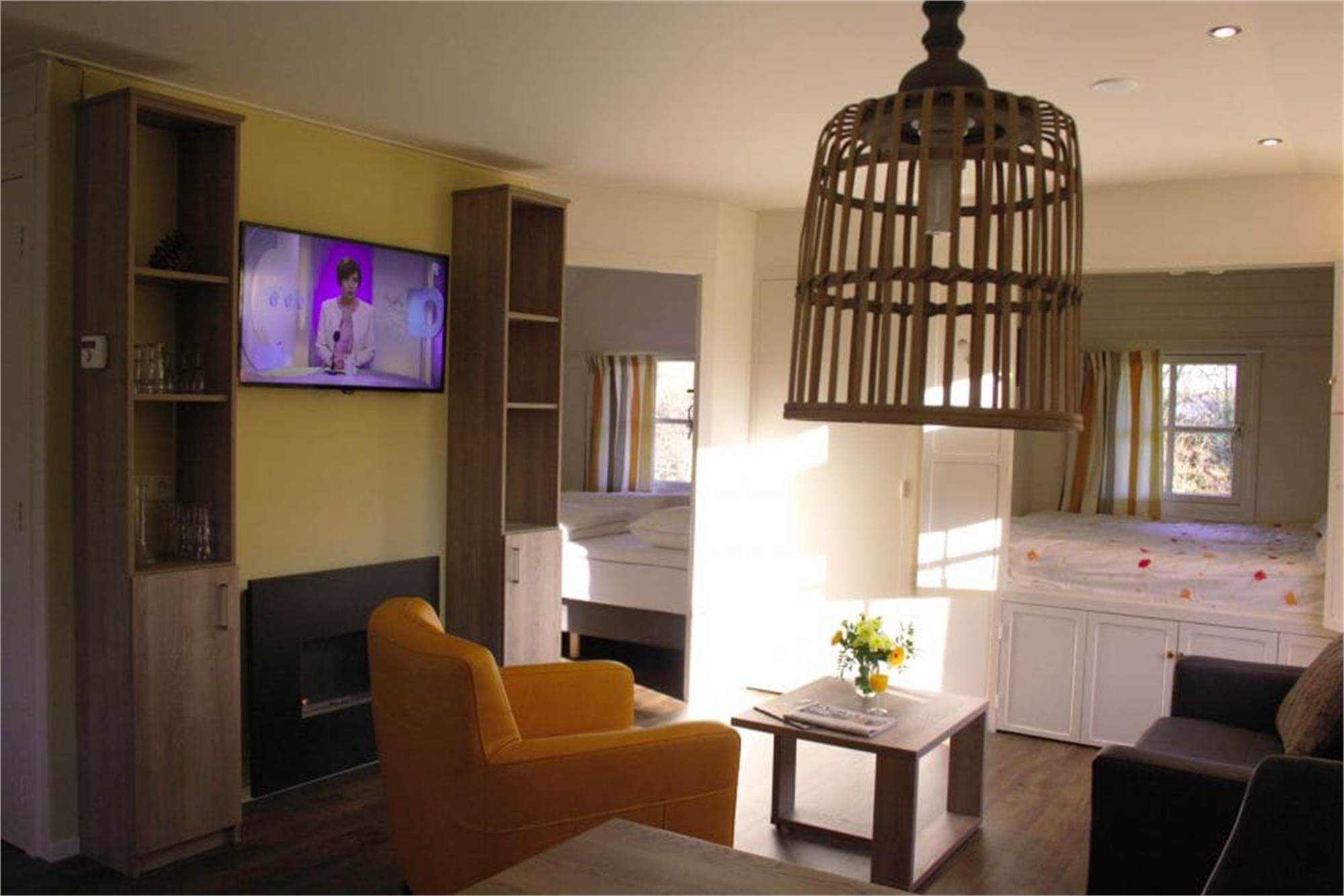Layout: living / bedroom with flat screen TV and bedstead. Kitchen with fridge freezer, dishwasher, oven, microwave and coffee maker. Heated bathroom floors and toilet. Bedroom with two single beds and one bedstead. Charging point for e-bike. Located on the edge of the forest.