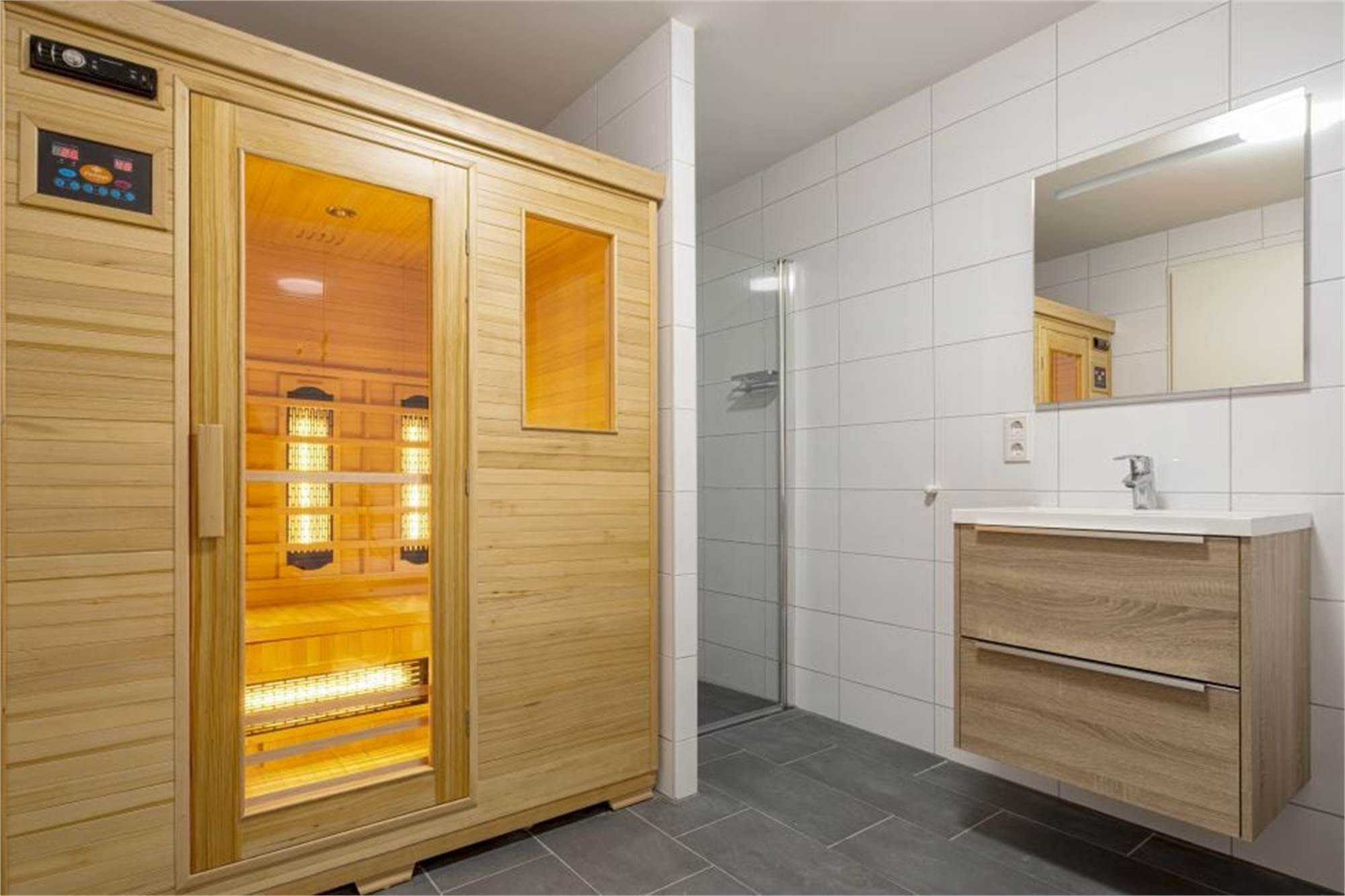 This single-storey bungalow can accommodate 8 people. The living room has a seating area with a TV, and there is a fireplace. The kitchen includes a fridge with freezer compartment and a combination microwave. There are 4 bedrooms with 2 single beds each. There is TV in 3 of the bedrooms. There are 2 bathrooms with a walk-in shower. There is 1 separate toilet and 1 toilet in a bathroom. The bungalow has an infra-red sauna. There is a deck with patio furniture outside. Parking is possible at the central parking.