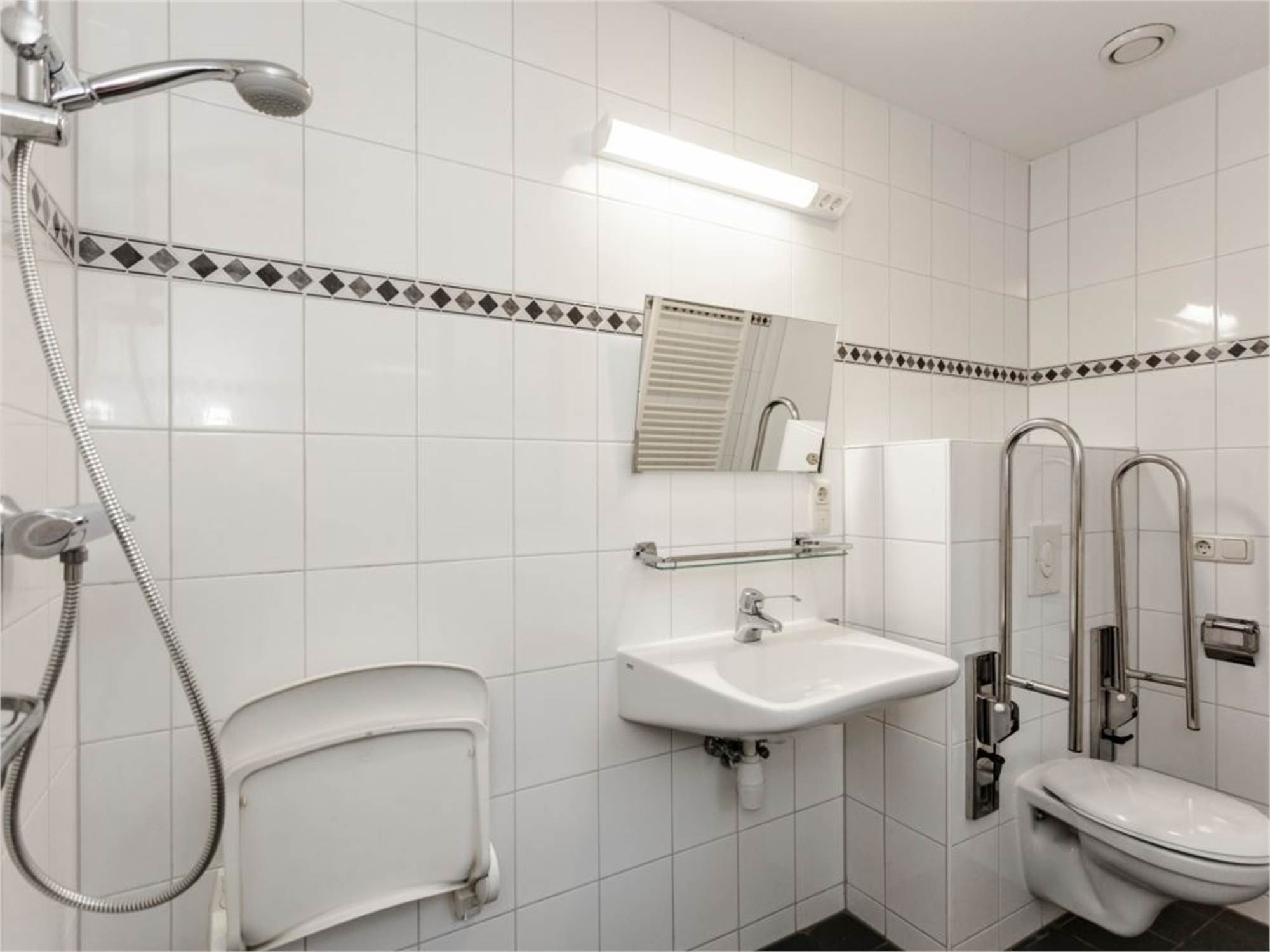 • Adapted bathroom with walk-in shower with shower seat without armrest, grabrails, washbasin a minimum of 78 cm high and wheelchair-friendly, adjustable mirror and turning circle a minimum of 150 cm