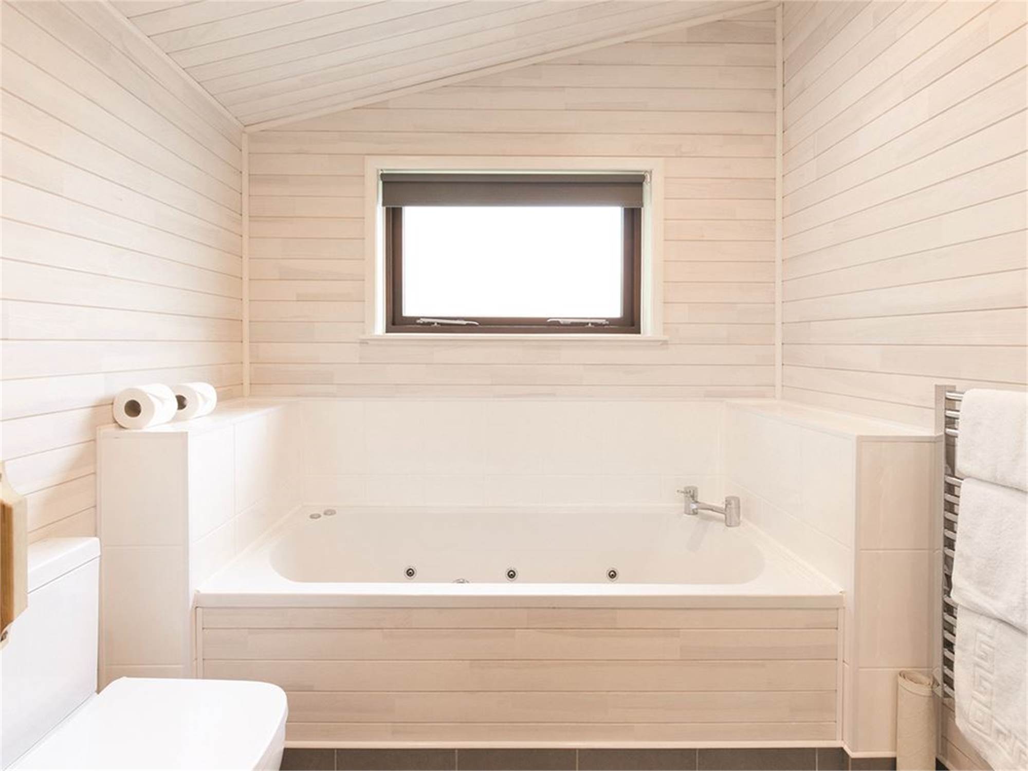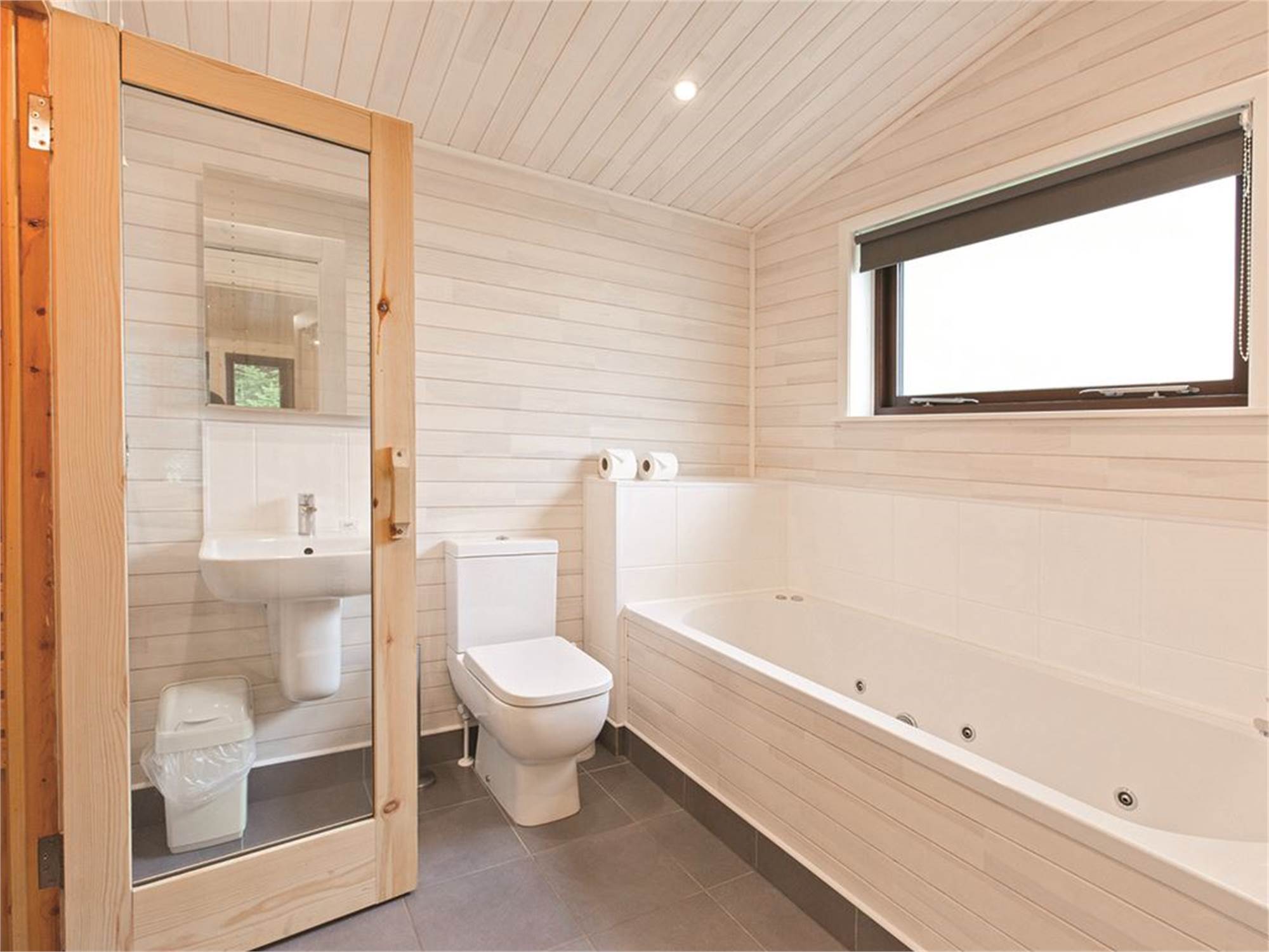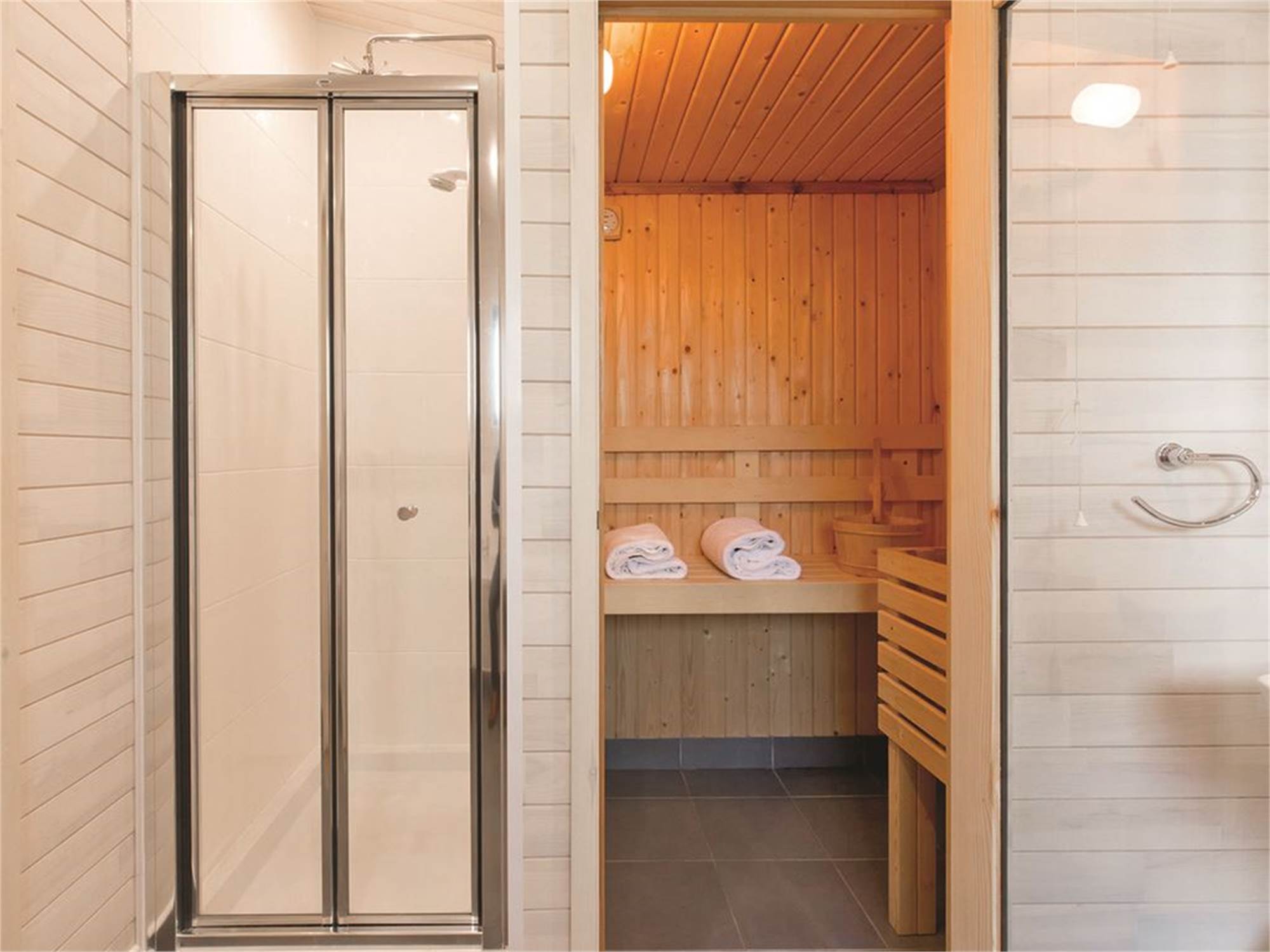 Bathroom with jacuzzi bathtub, shower cubicle, sauna, washbasin and toilet