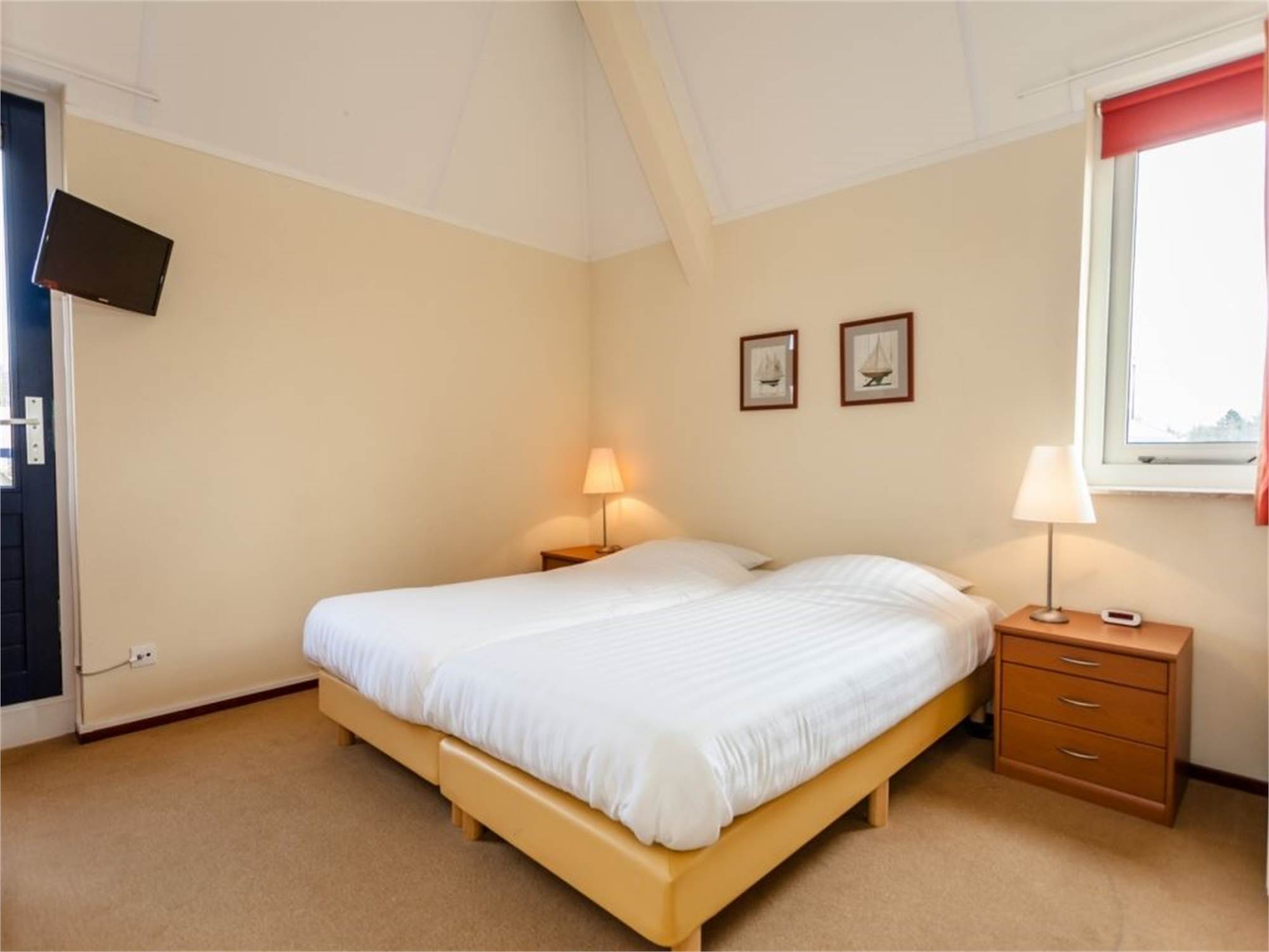 Bedroom with two single box spring beds, 2 person soft mattress topper and flatscreen TV on the first floor