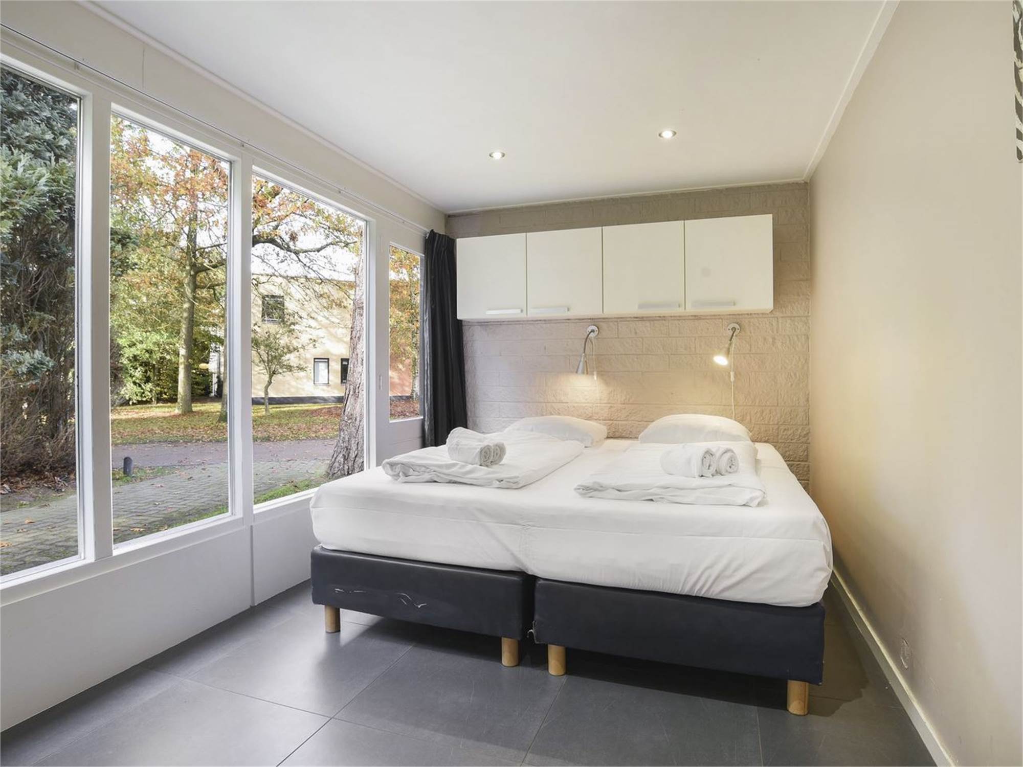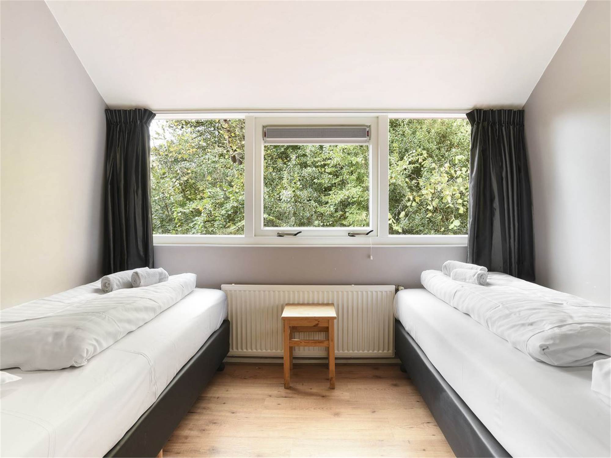 Bedroom with two single box spring beds, space next to the bed a minimum of 60 cm and turning circle a minimum of 120 cm