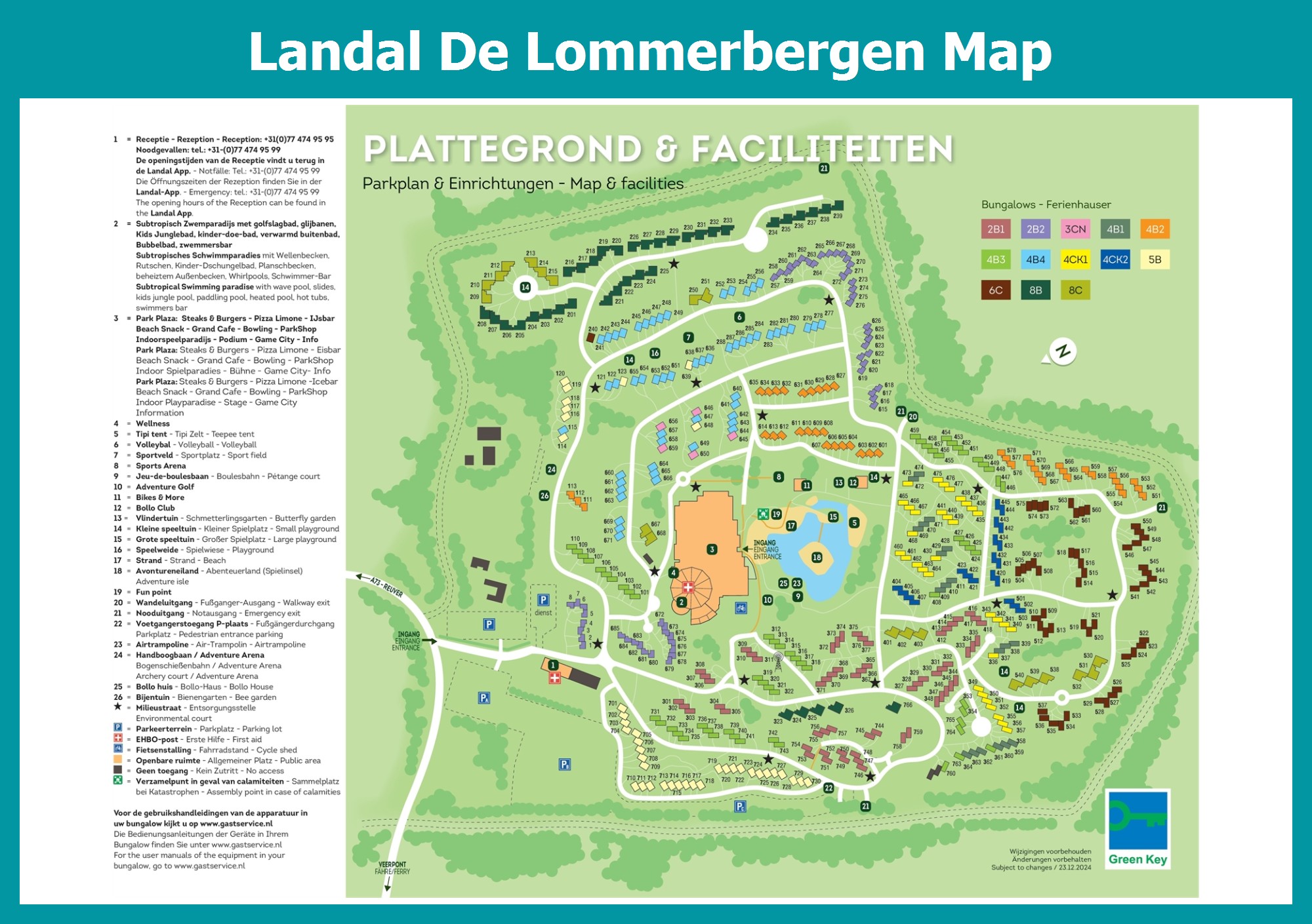 Up-to-date and comprehensive village map of Landal De Lommerbergen with all accommodations and facilities, also available as PDF.
