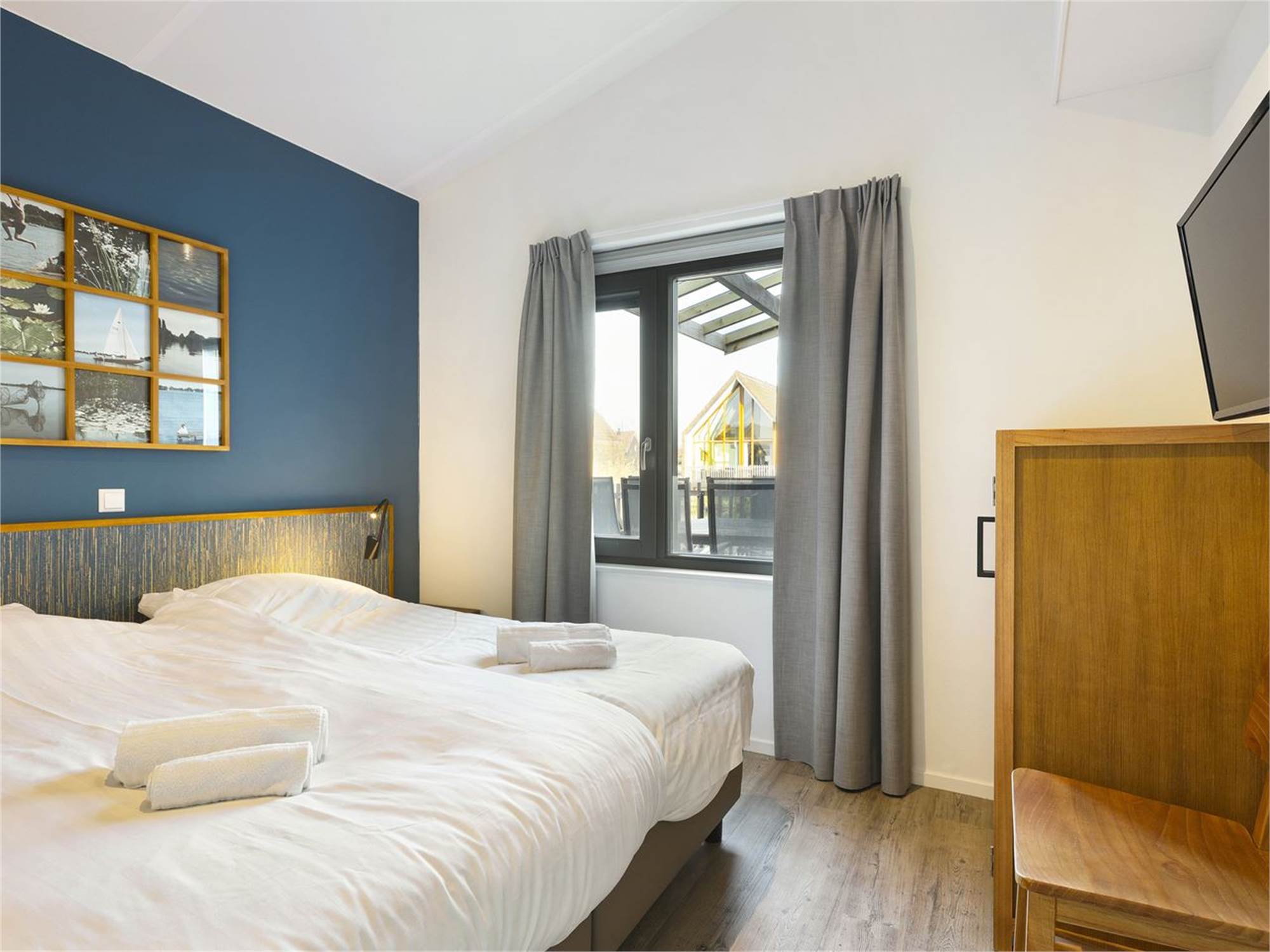 Bedroom with a 2-person bed, 2-person soft mattress topper and flatscreen TV