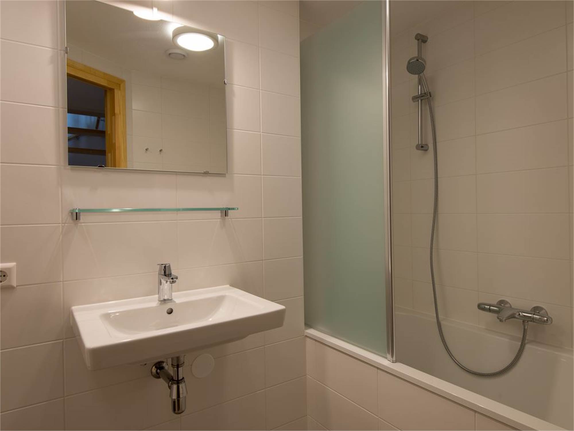 Bathroom with bathtub, walk-in shower, washbasin and toilet in basement