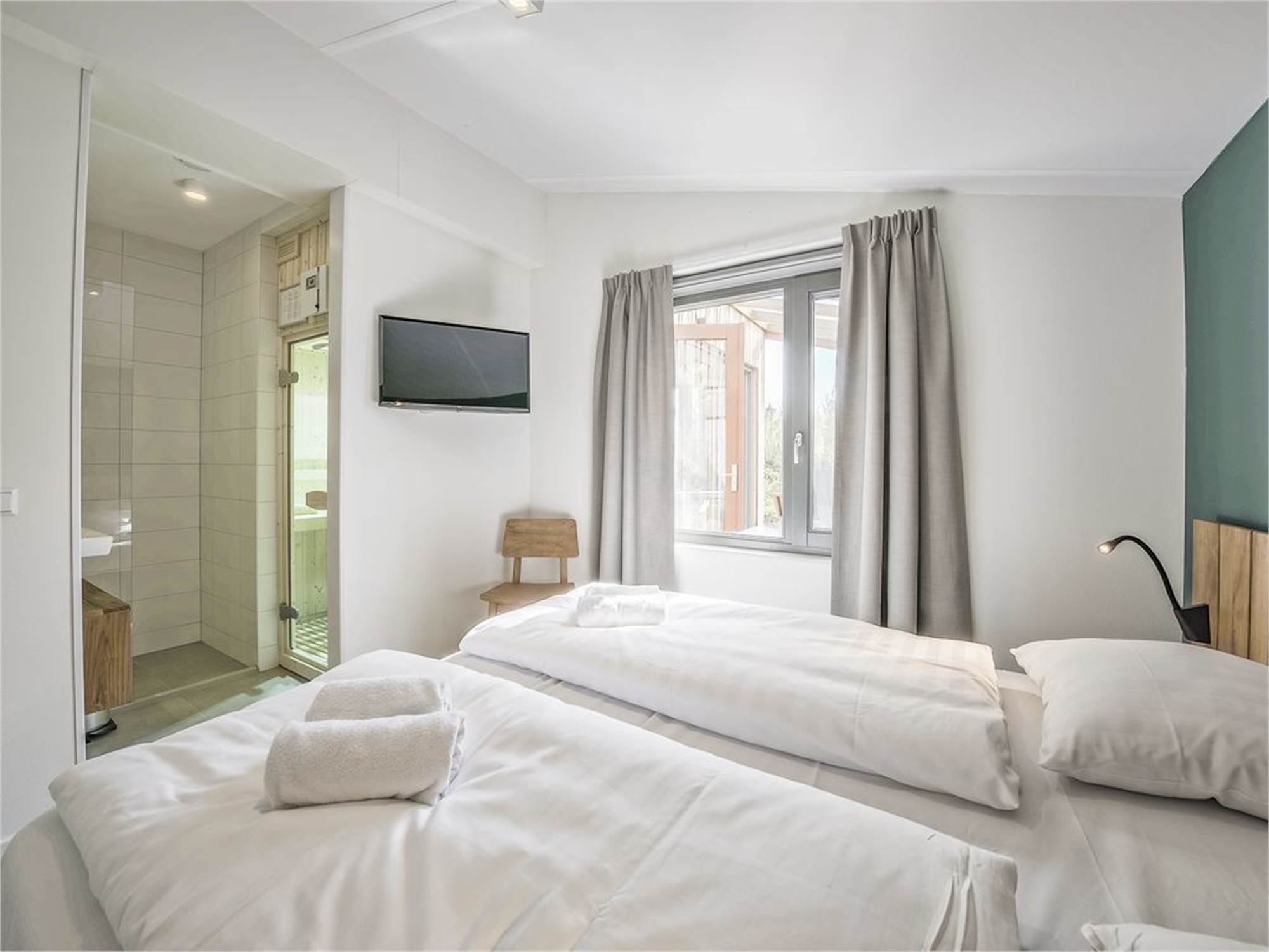 Bedroom with two single box spring beds, 2 person soft mattress topper and flatscreen TV