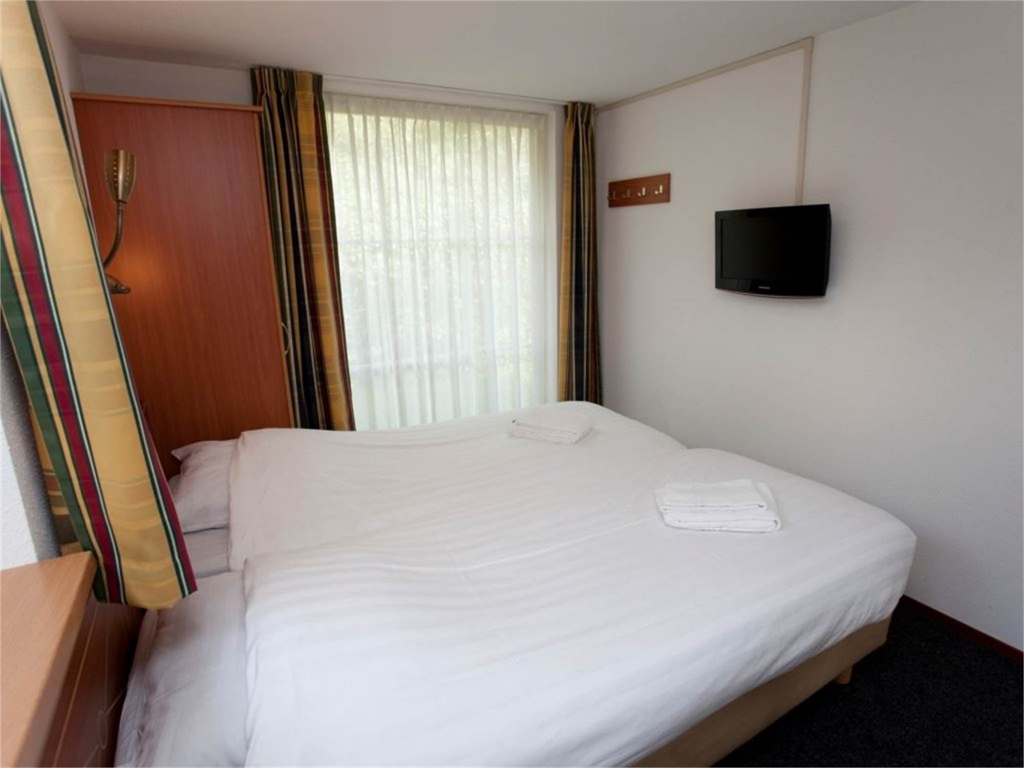 Bedroom with two single box spring beds, soft mattress topper and TV