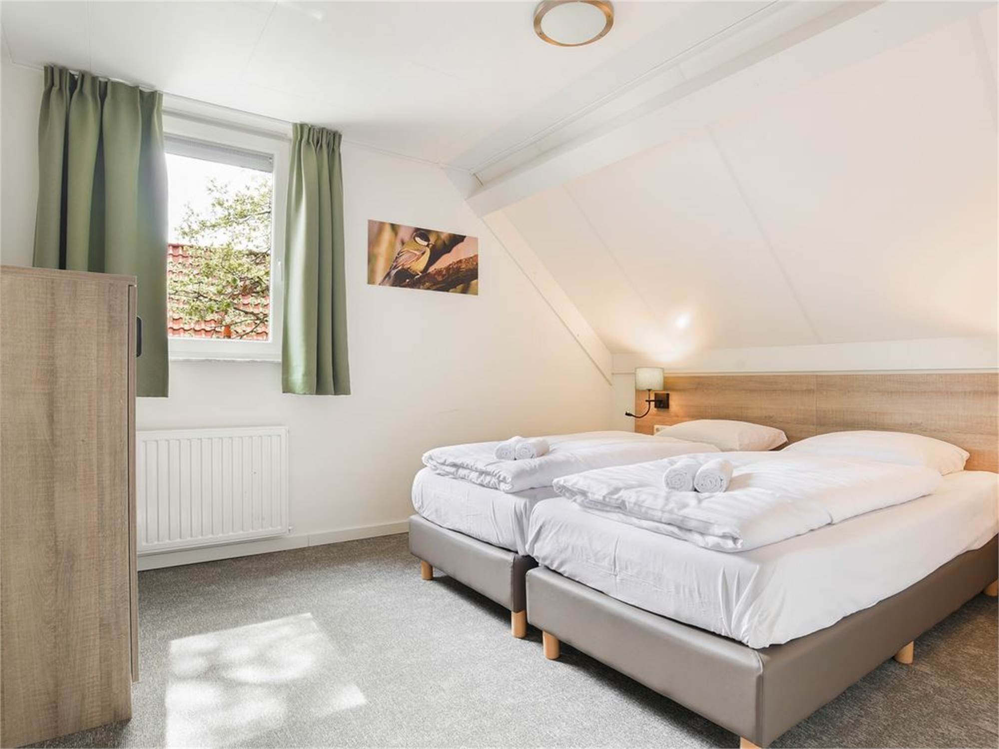 Two bedrooms with two single box spring beds on the first floor