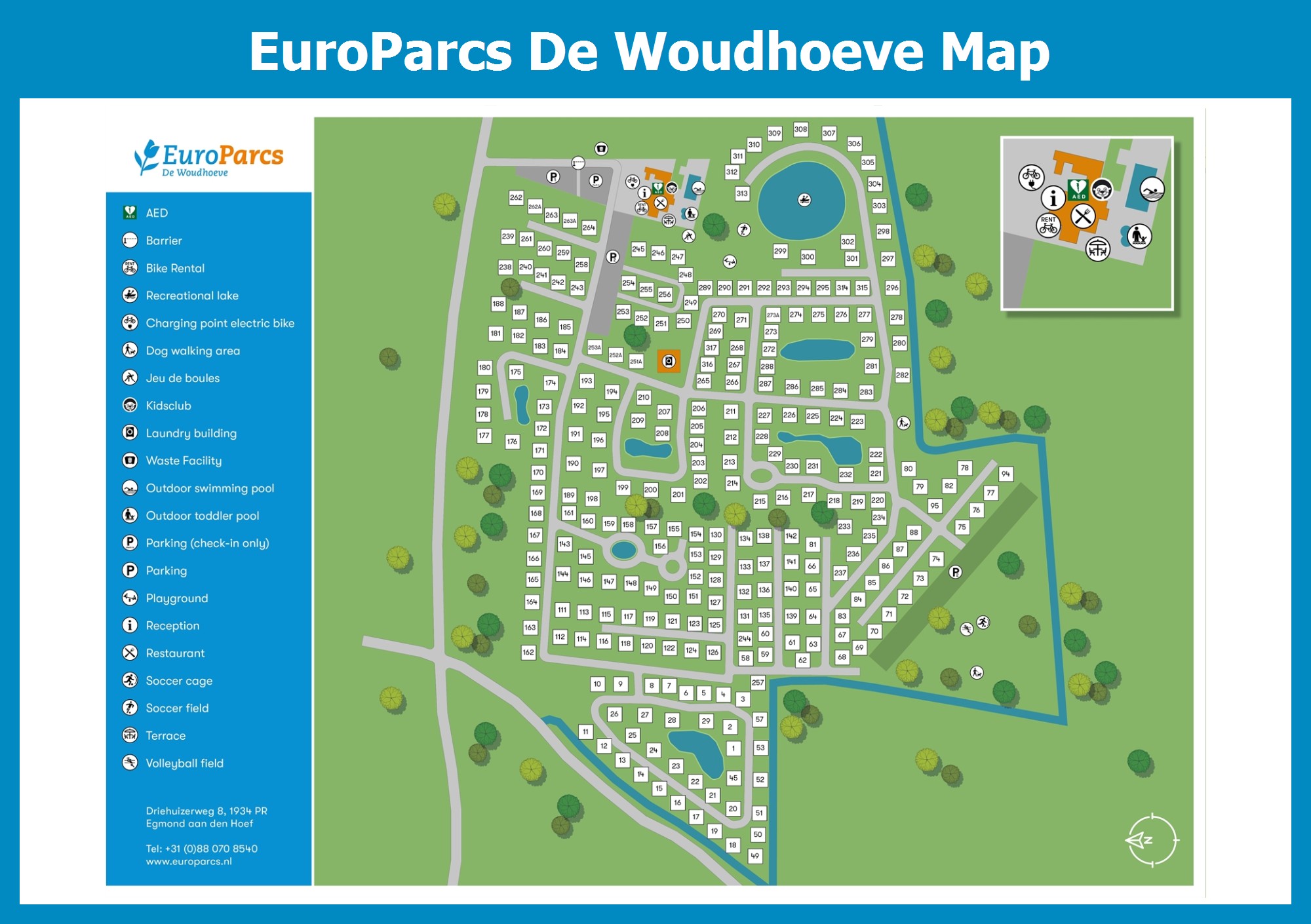 Up-to-date and comprehensive village map of EuroParcs De Woudhoeve with all accommodations and facilities, also available as PDF.
