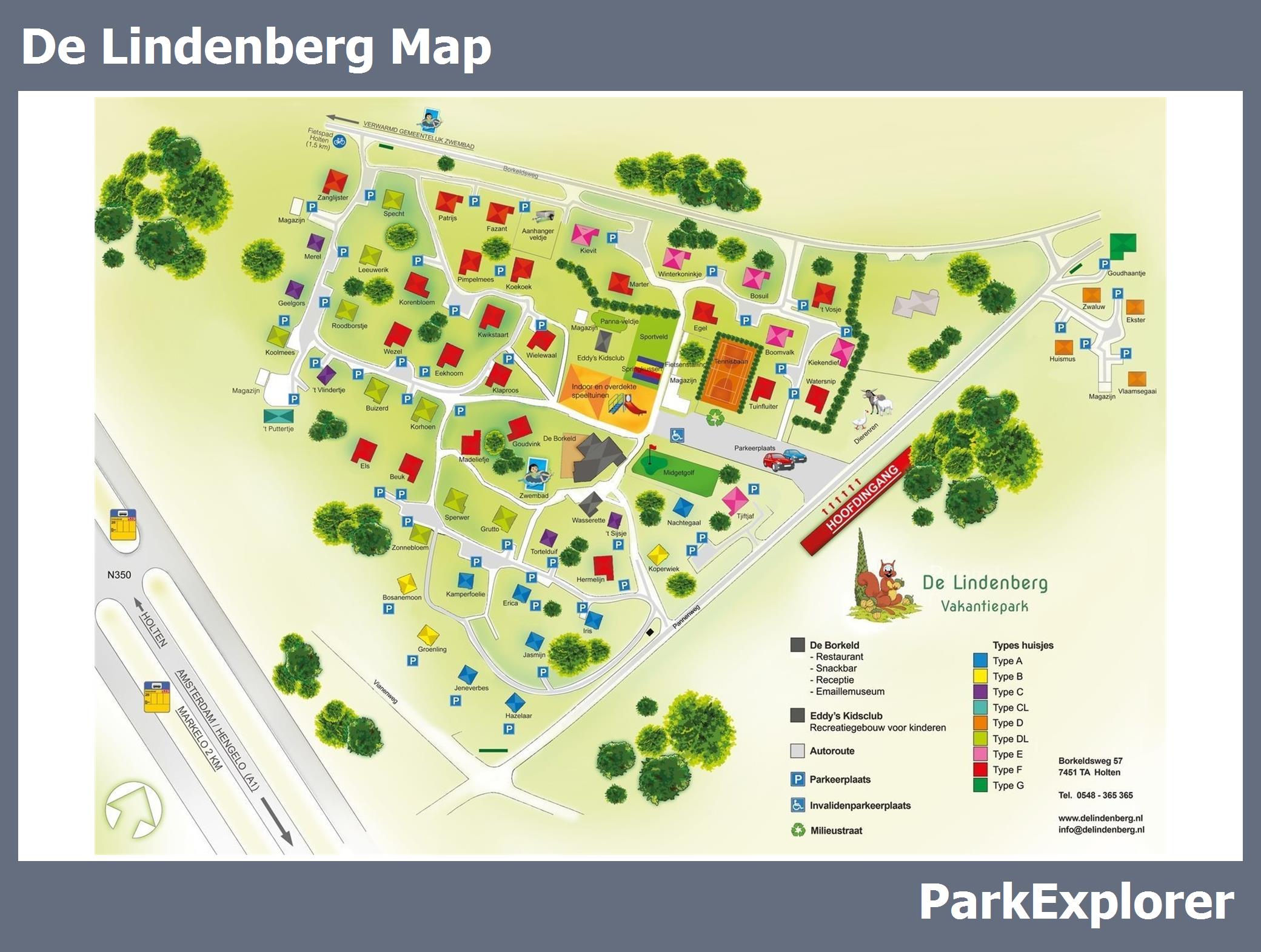 Up-to-date and comprehensive village map of De Lindenberg with all accommodations and facilities, also available as PDF.
