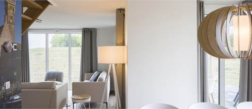 This villa sleeps six and is located at the outer edge of the park. Downstairs are a living room with a seating area and a smart TV and an adjacent open plan kitchen with a dining area. The kitchen is equipped with a dishwasher and a coffee capsule machine. There is also one bedroom downstairs with a private bathroom that has a walk-in rain shower and a toilet. There is a separate toilet in the hallway as well as a storage room with washing machine and dryer. Upstairs there are two bedrooms and a bathroom with a shower and a toilet. All the bedrooms are furnished with two single beds. Outside, there is a patio with garden furniture and parking space is available for two cars. Wi-Fi is available free of charge.