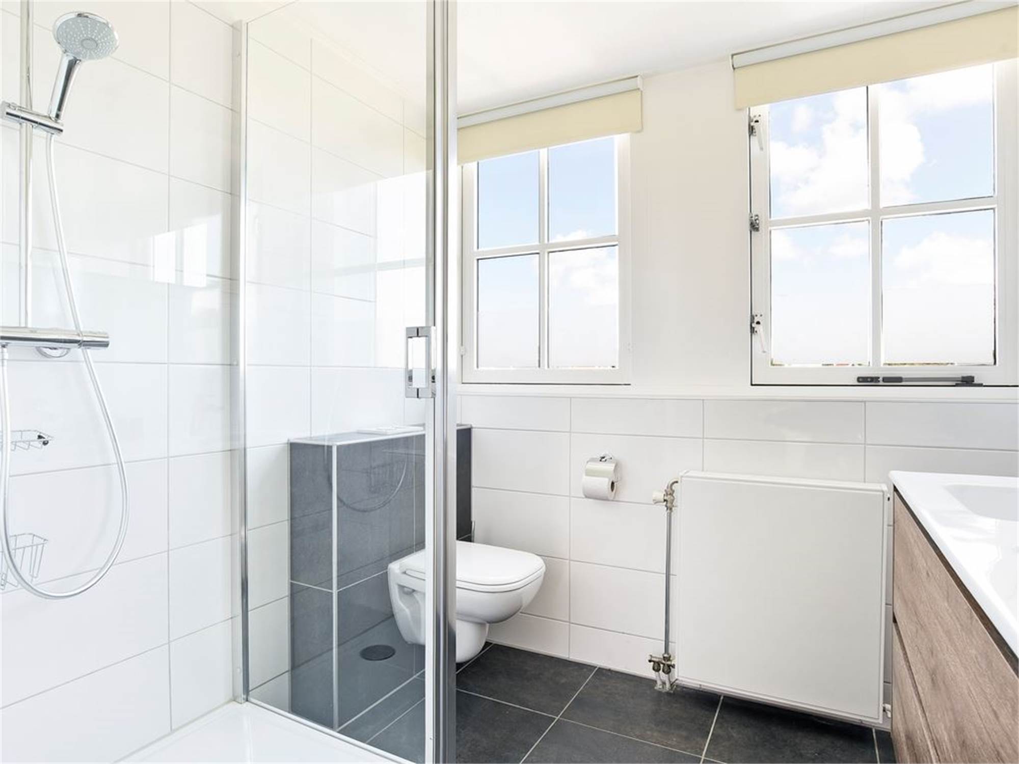 Bathroom with shower cubicle, double washbasin and toilet on the first floor
