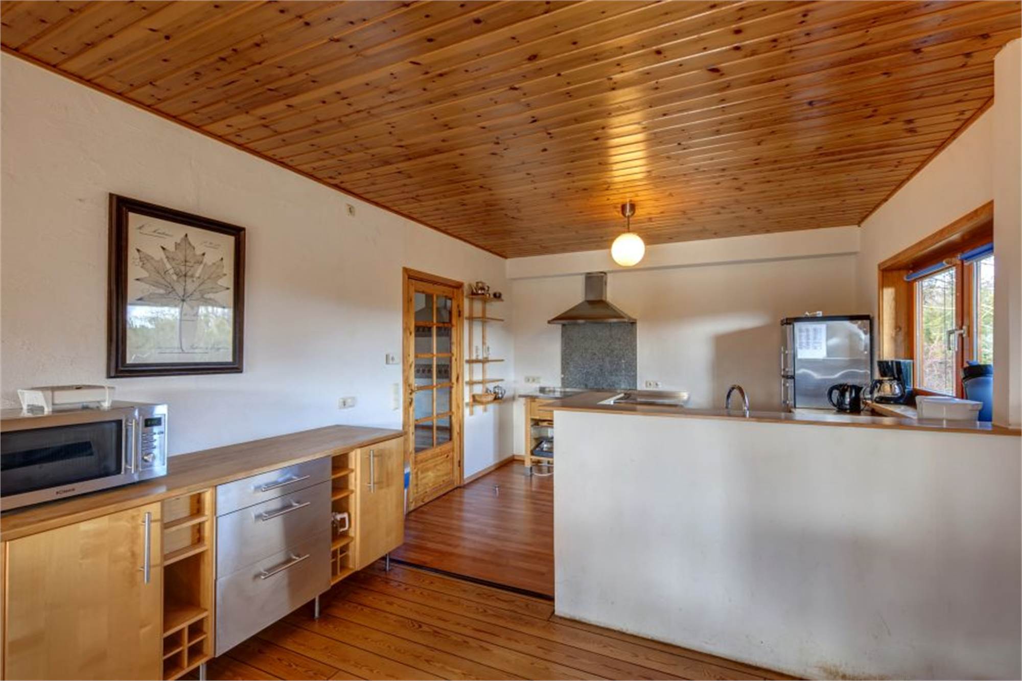 Ground floor: Large L-shaped living room with doors to the terrace. Open-plan kitchen equipped with dishwasher, combination microwave and large refrigerator with freezer compartment. Two bedrooms, one with two single box spring beds and one with a bunk bed. Bathroom with toilet, shower or shower cabin, bath and washbasin. Separate toilet.