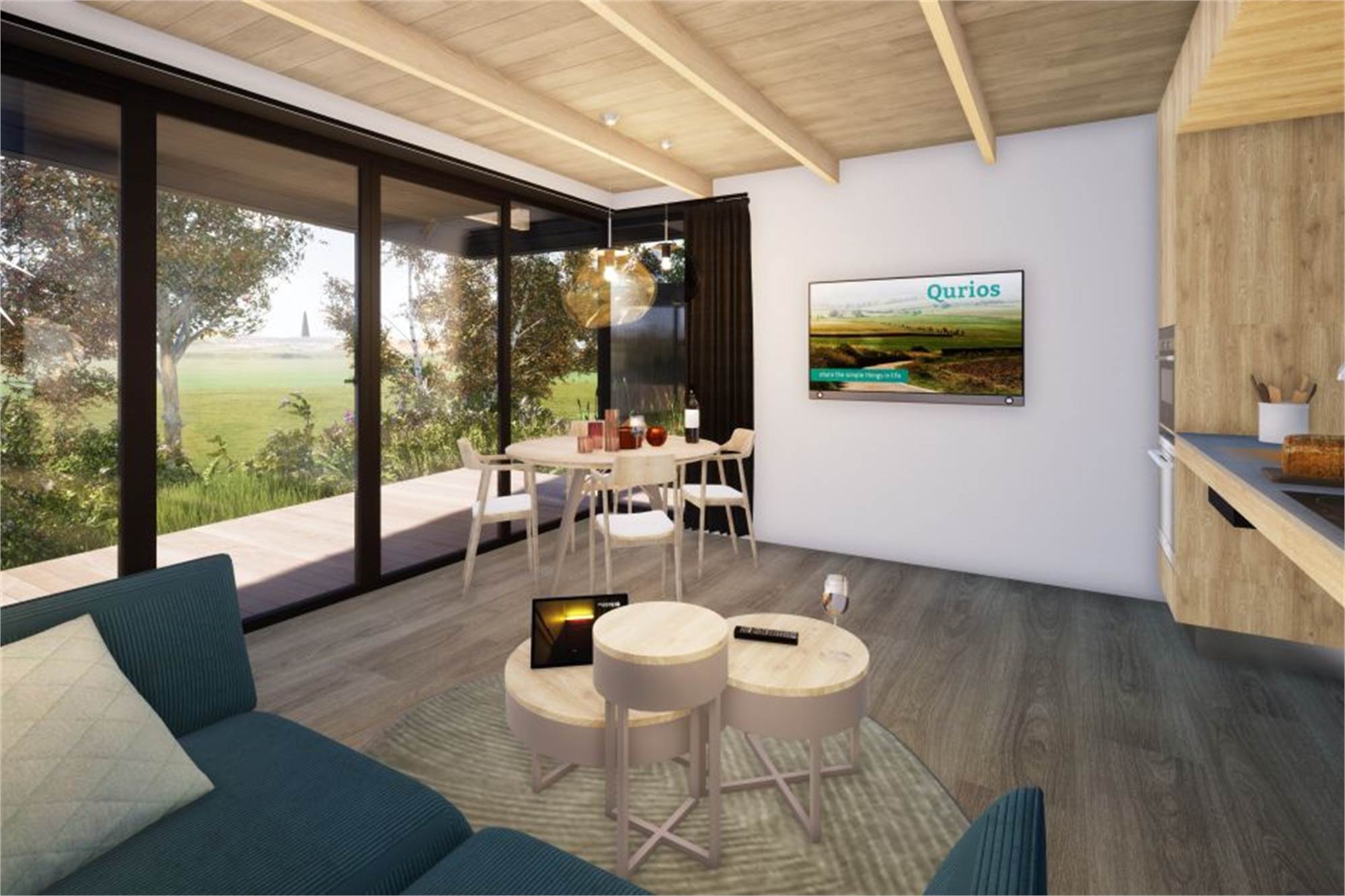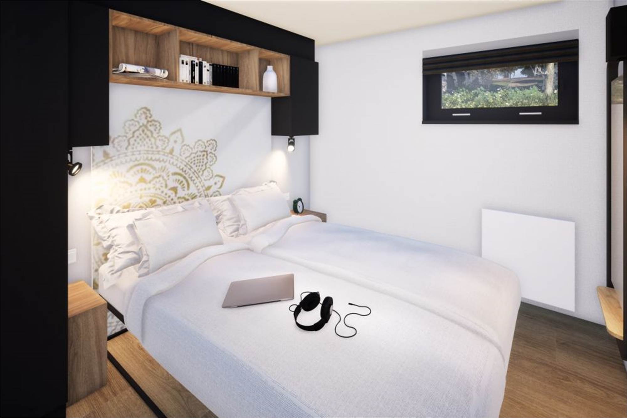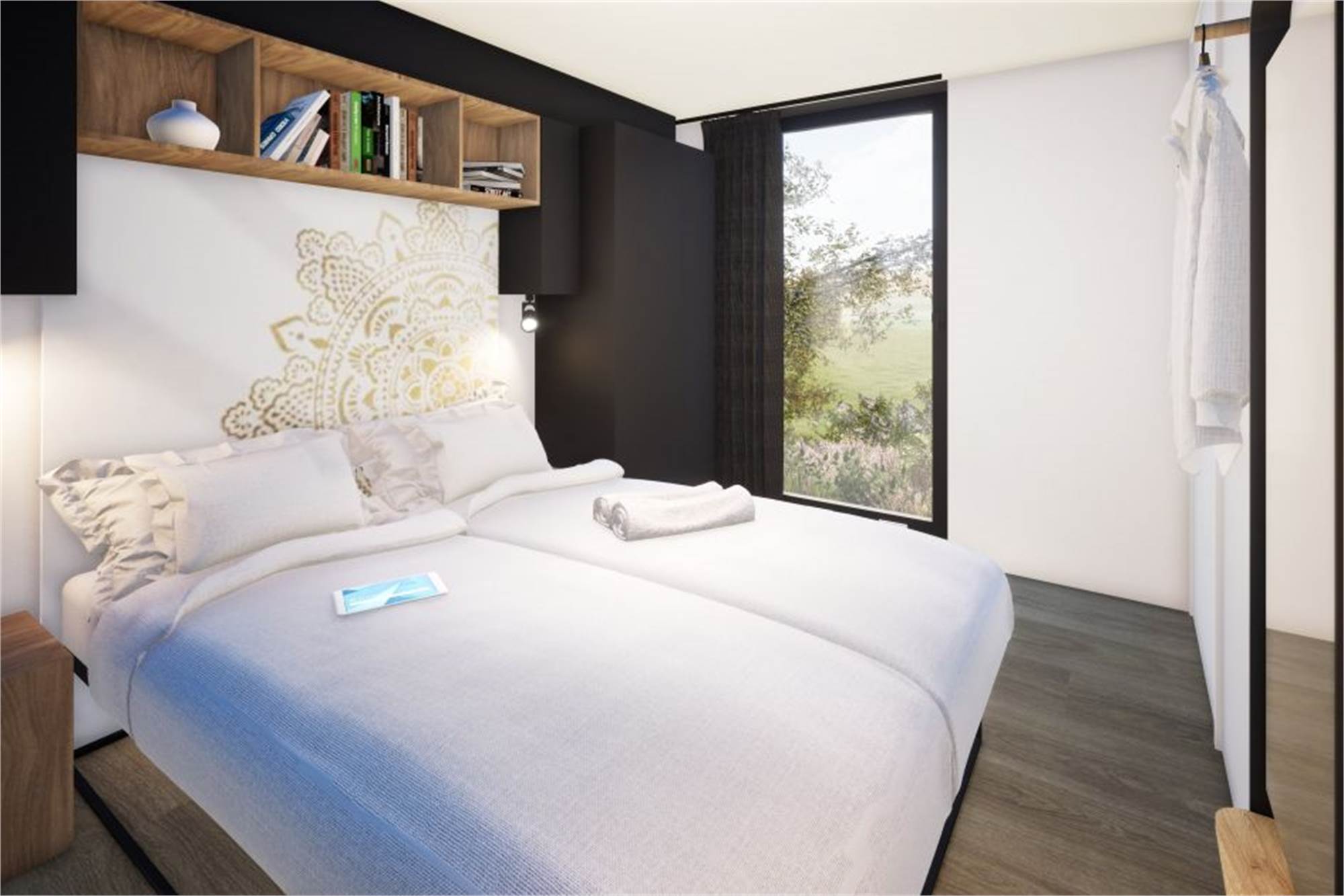 This single-storey detached lodge can accommodate 4 adults and 1 child. The lodge is suitable for disabled people. The living room has a seating area, dining area, TV and underfloor heating. The open-plan kitchen has a dishwasher, coffee capsule machine, kettle, combination microwave, and fridge-freezer combination. There are 2 bedrooms with 2 single beds each. The beds are extra long, being 210cm. The bathroom has a walk-in rain shower, toilet and underfloor heating. The lodge has a garden with a partially covered terrace with patio furniture. You can park in the central parking. Free Wi-Fi.
