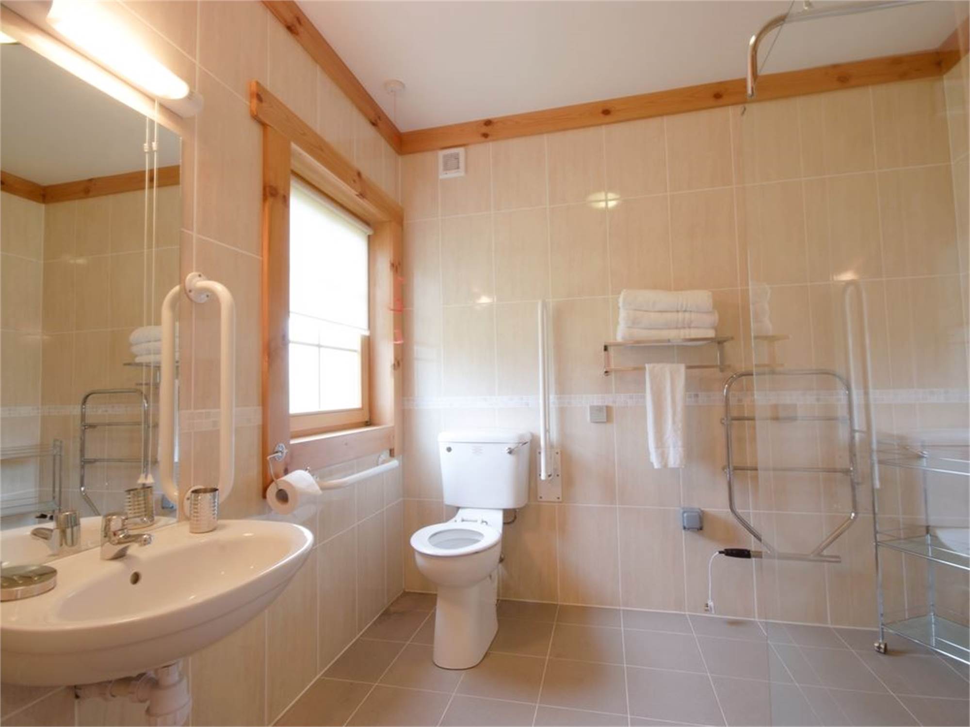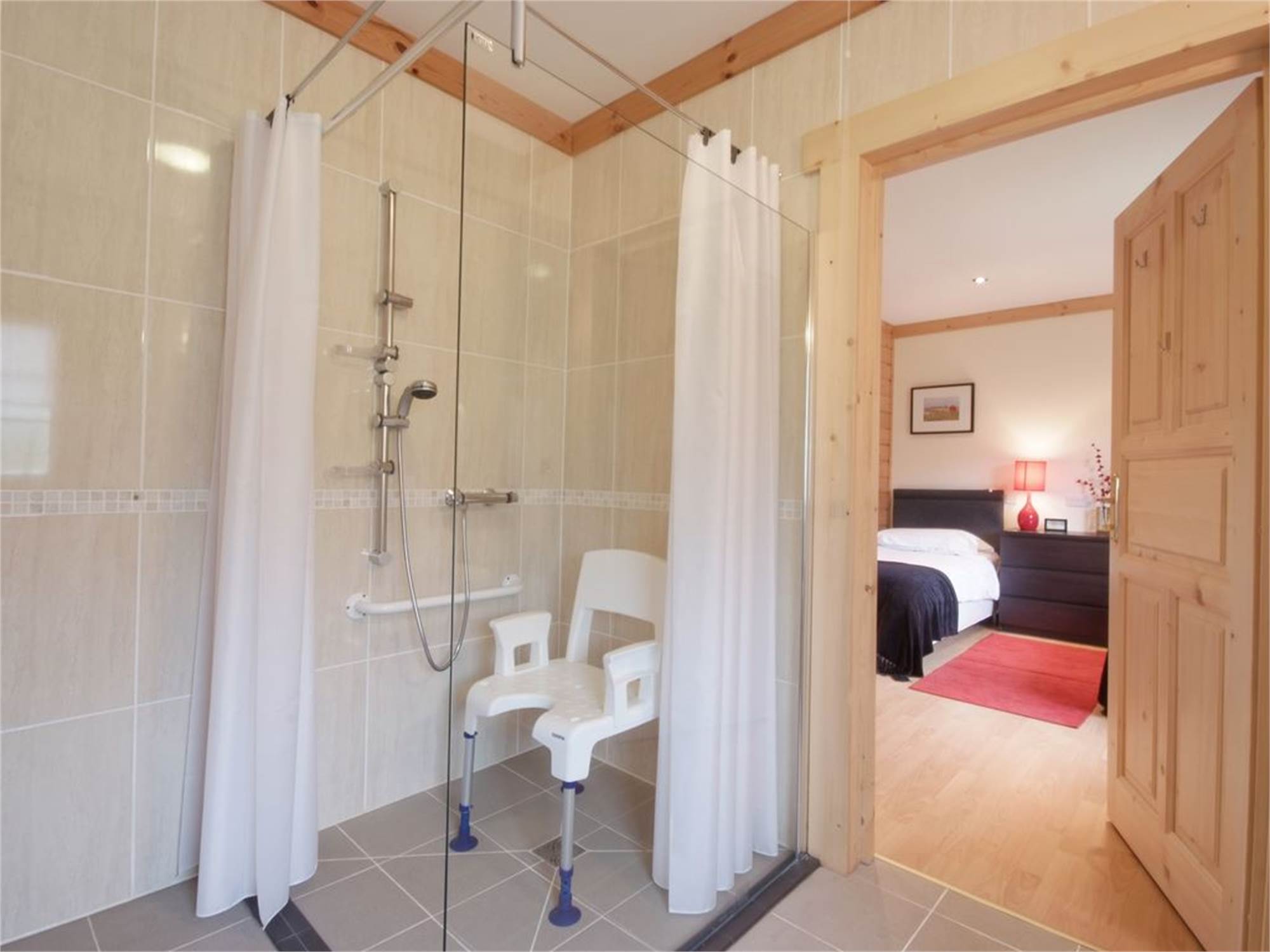 Adapted bathroom with walk-in shower, shower seat with armrest, toilet with grab rails and washbasin a minimum of 78 cm high, wheelchair friendly and adjustable mirror or full-length mirror