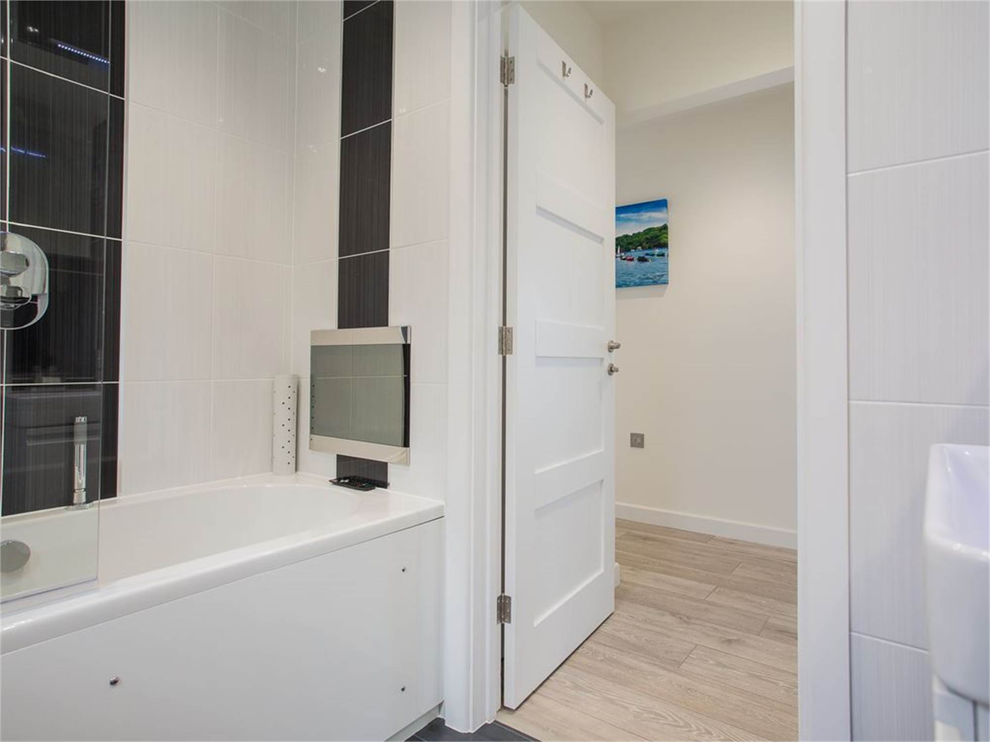 Adapted bathroom en suite with walk-in shower, shower seat, toilet with grab rails, adapted washbasin and adjustable mirror or full-length mirror