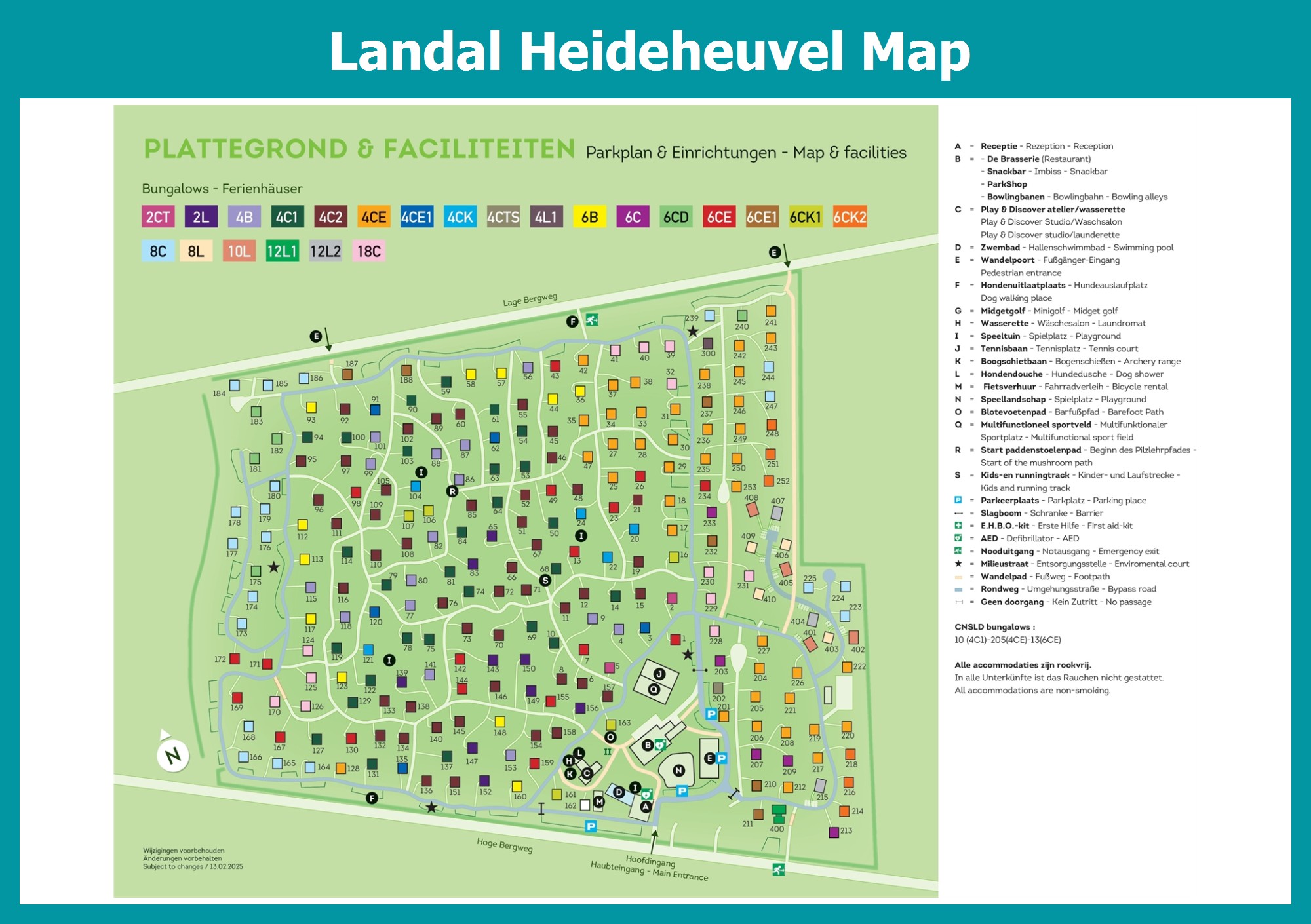 Up-to-date and comprehensive village map of Landal Heideheuvel with all accommodations and facilities, also available as PDF.