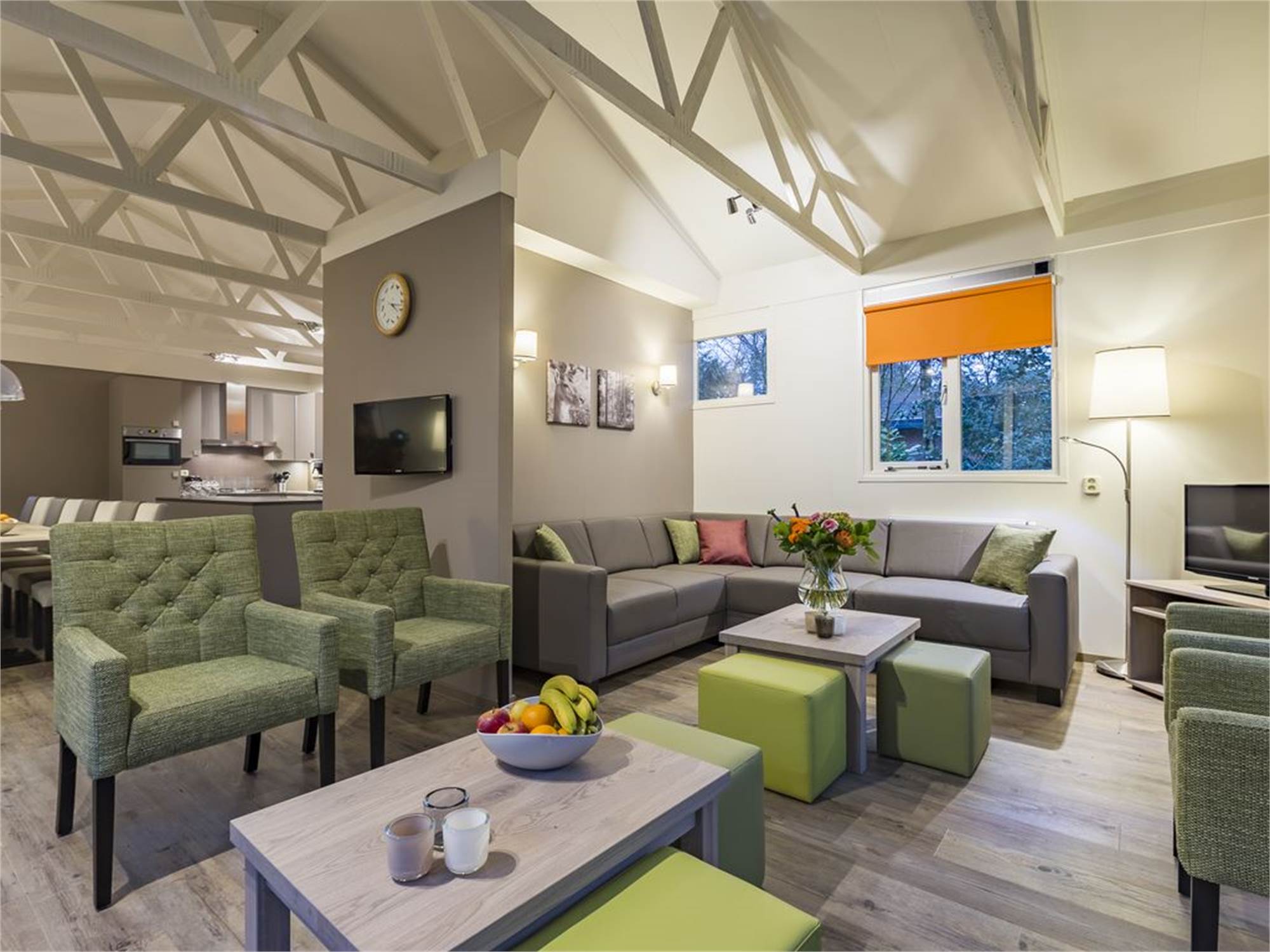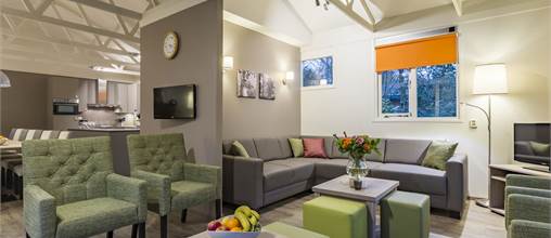 The living accommodation is laid out like a large living room for 16 people with a large kitchen-dining area