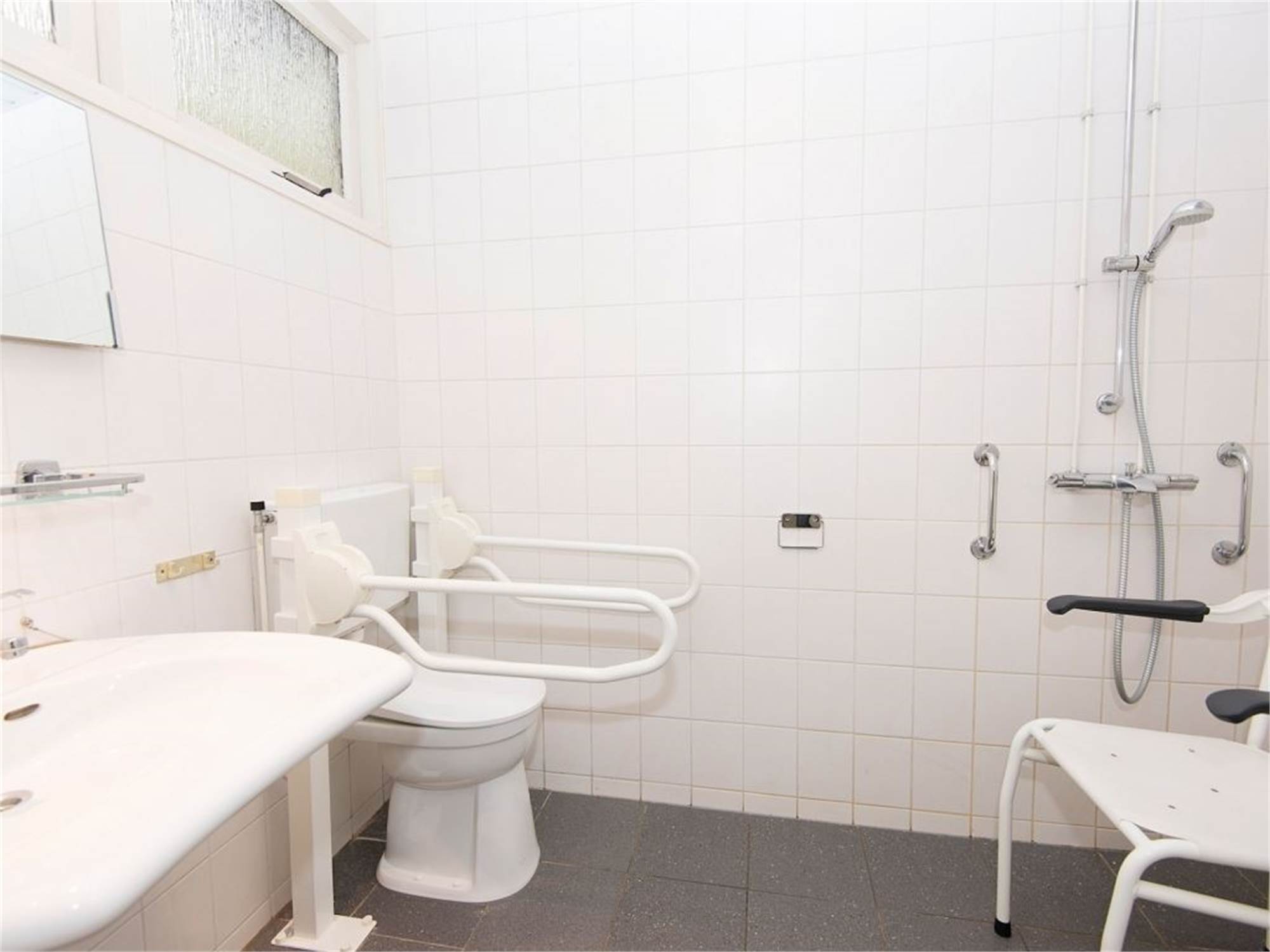 Adapted bathroom with walk-in shower, grab rails in shower cubicle, shower seat with armrest, single lever mixer taps, washbasin a minimum of 78 cm high and wheelchair-friendly, adjustable mirror and turning circle a minimum of 120 cm