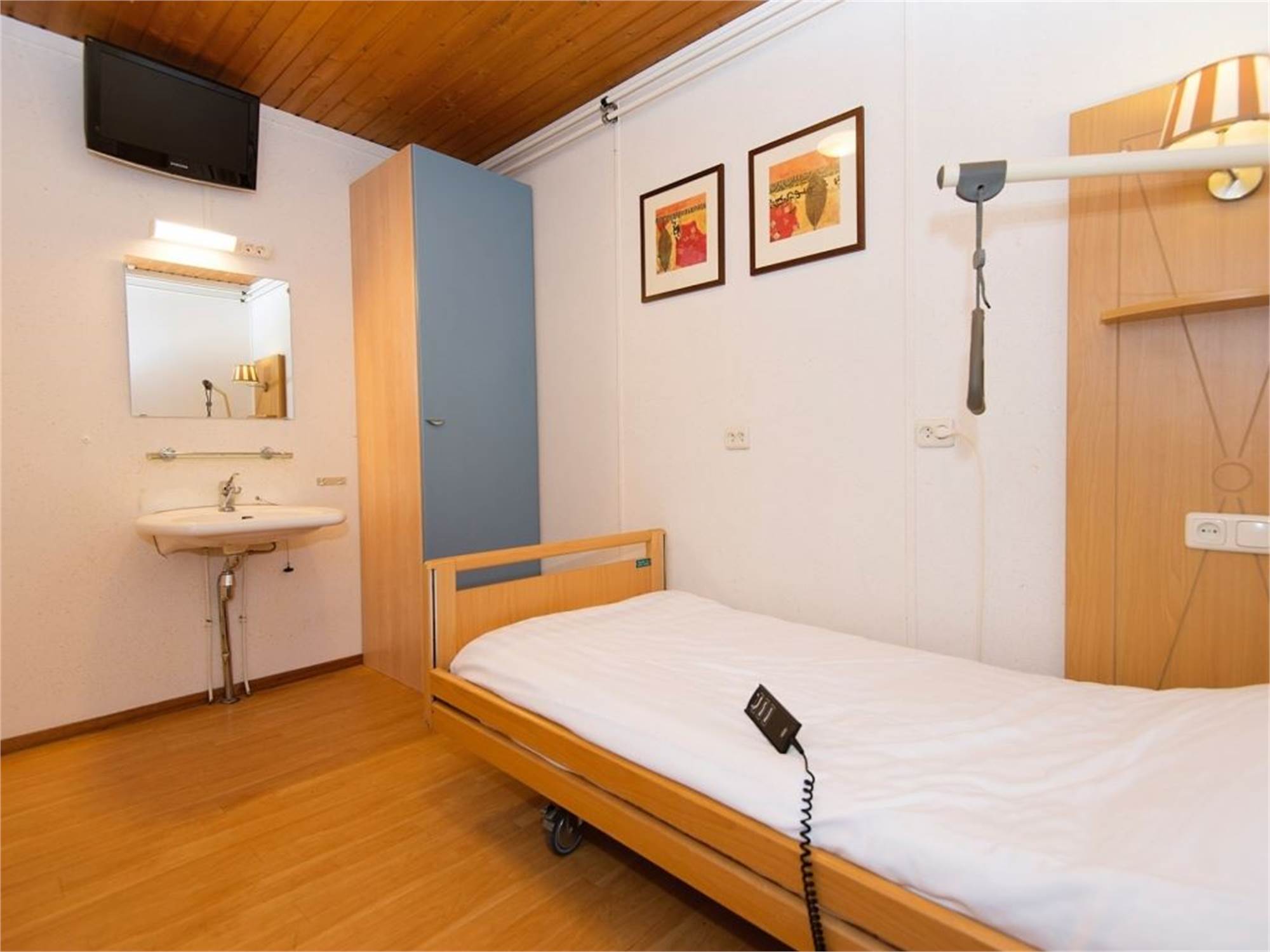 Adapted bedroom with one high-low bed with monkey pole, soft mattress topper, space next to the bed a minimum of 90 cm and turning circle a minimum of 150 cm