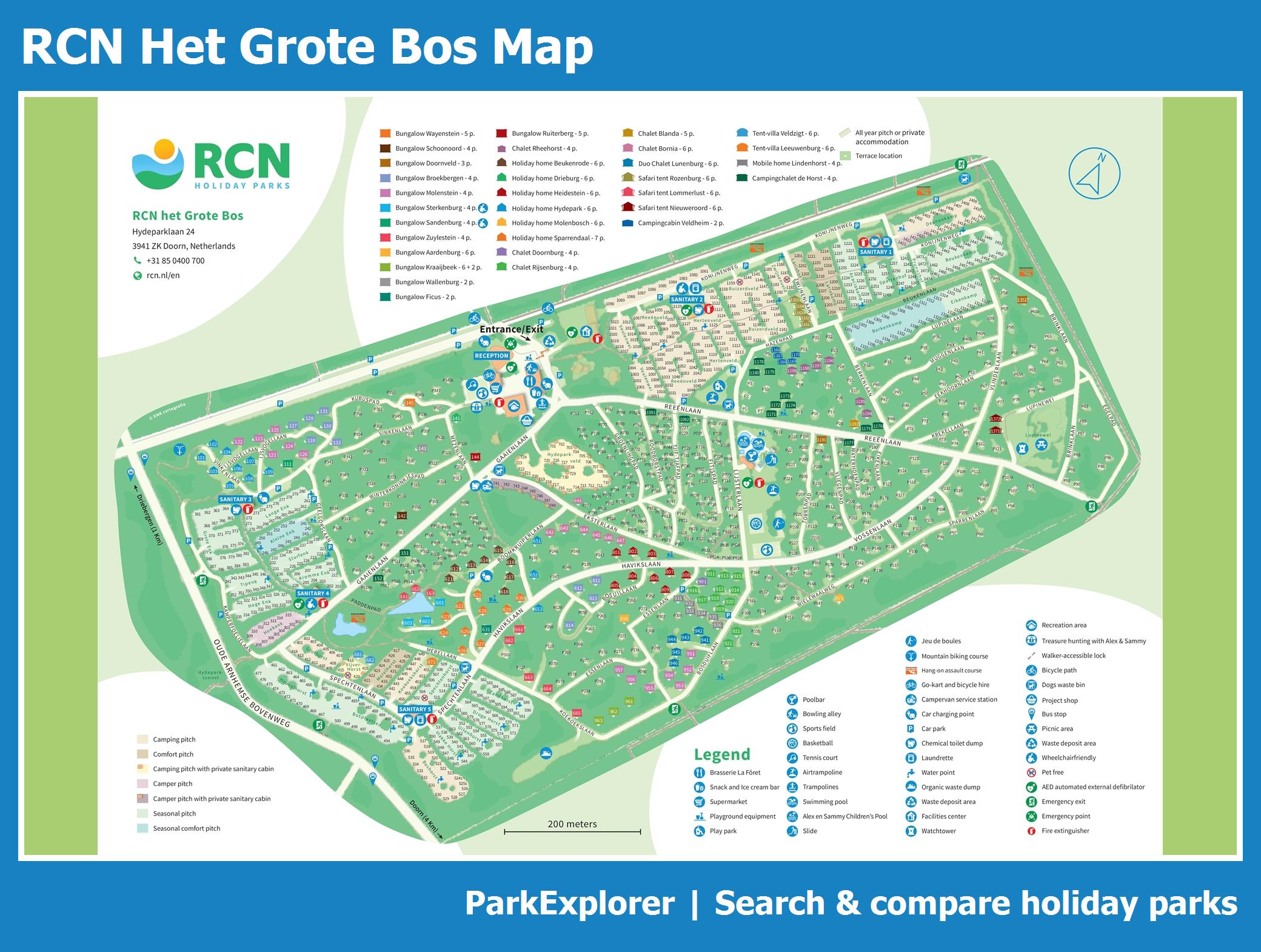 Up-to-date and comprehensive village map of RCN Het Grote Bos with all accommodations and facilities, also available as PDF.