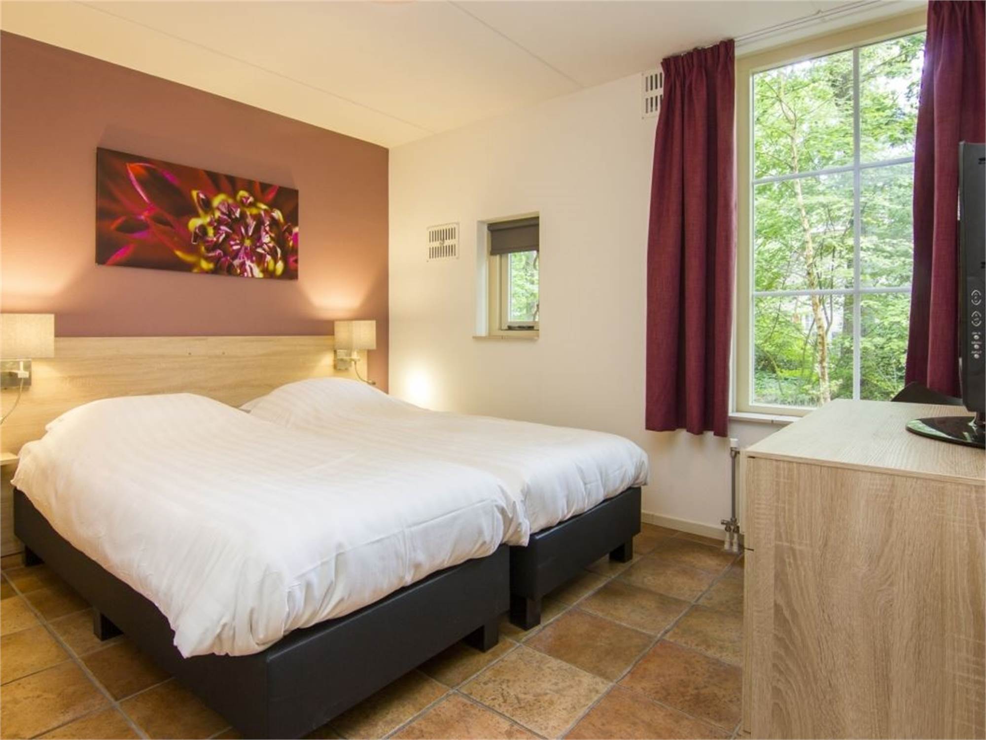 Bedroom with two single box spring beds, 2 person soft mattress topper and flatscreen TV
