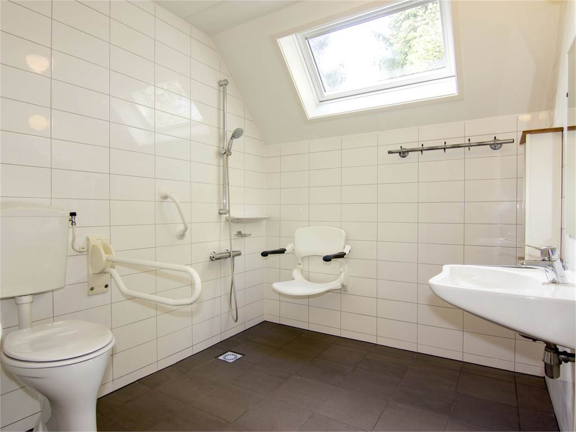 • Adapted bathroom with walk-in shower, shower seat with armrest, raised toilet with grab rails and washbasin a minimum of 78 cm high, wheelchair friendly and turning circle a minimum of 150 cm