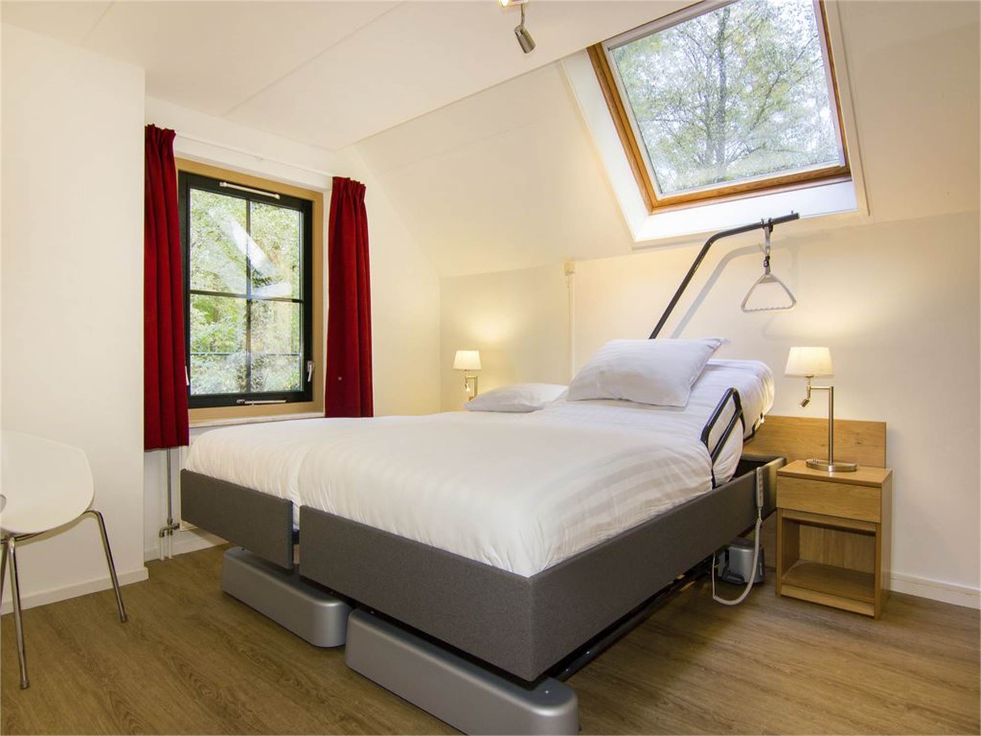 • Adapted bedroom with two single high-low box spring beds with adjustable headrest and monkey pole, siderail and turning circle a minimum of 120