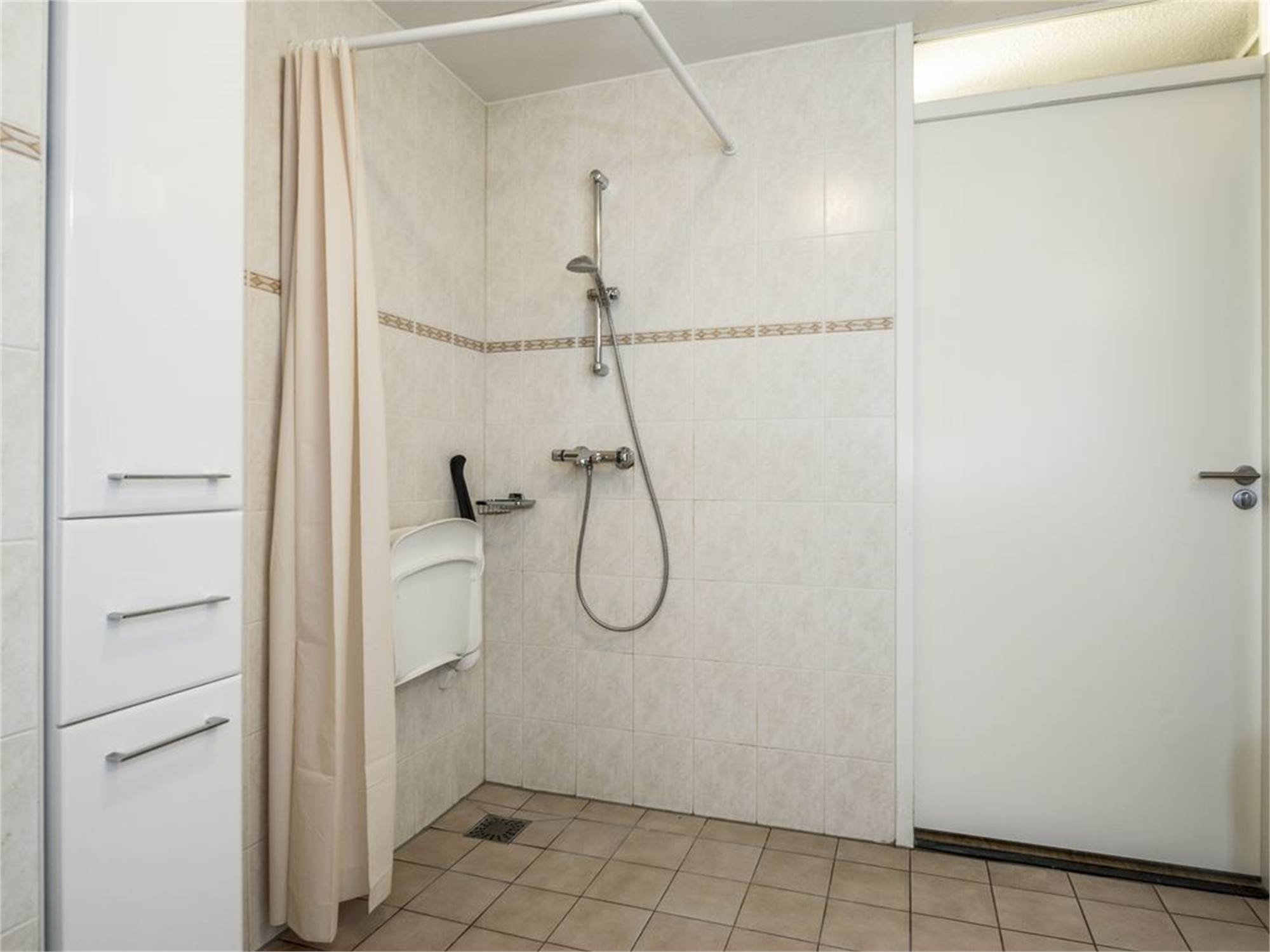 Adapted bathroom with shower cubicle, grab rails in shower cubicle, shower seat with armrest, washbasin a minimum of 78 cm high and wheelchair-friendly, single lever mixer taps, adjustable mirror and turning circle a minimum of 130 cm