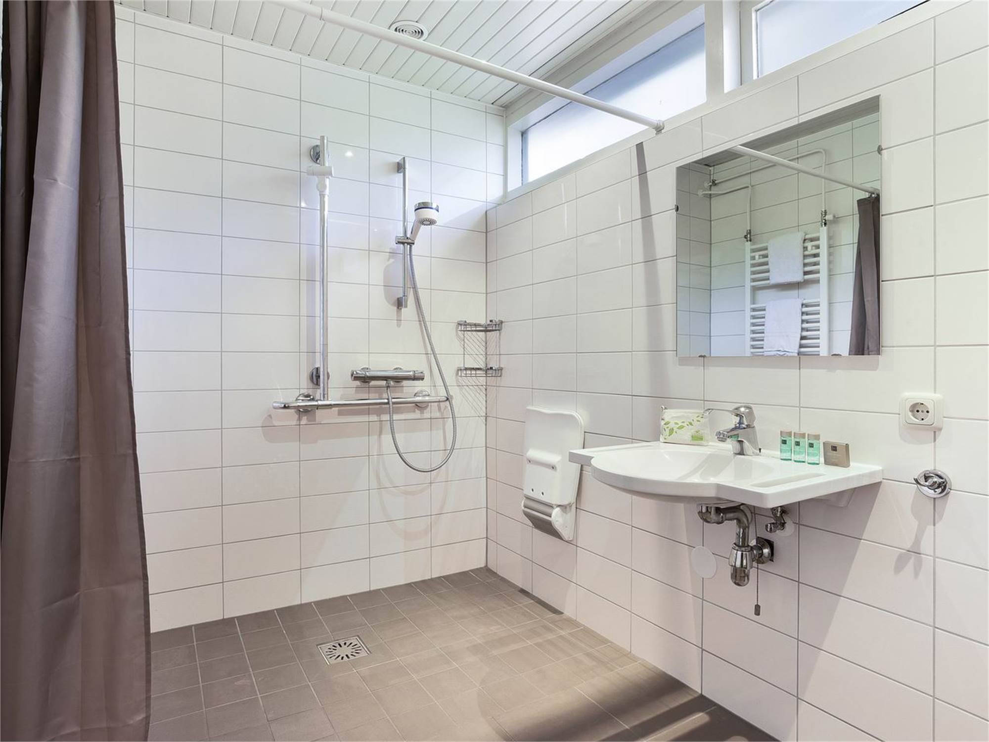 Adapted bathroom with walk-in shower, shower seat with armrest, adjustable shower head, adapted washbasin, adjustable mirror and turning circle a minimum of 100 cm