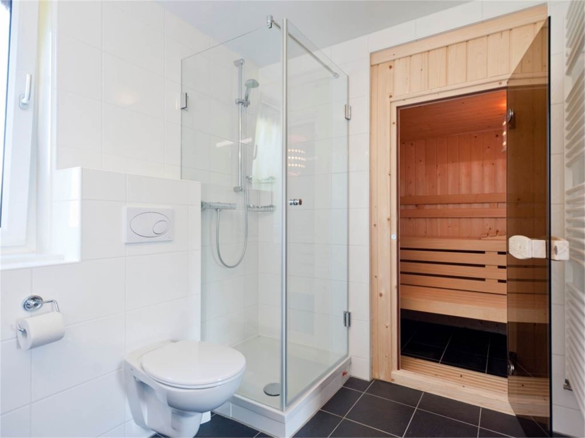 Bathroom with shower cubicle, double washbasin and toilet on the first floor