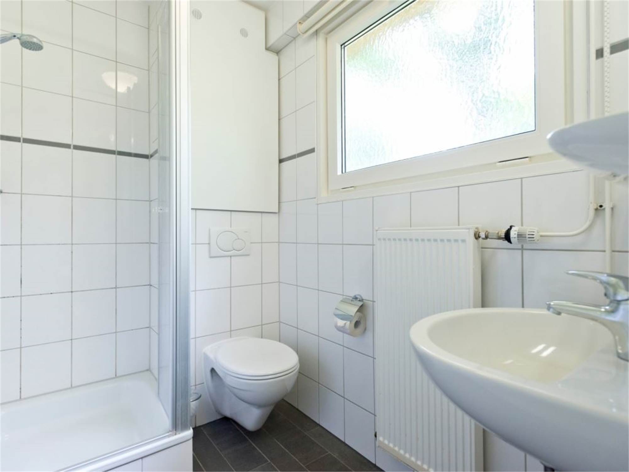 Bathroom with rain shower, washbasin and toilet