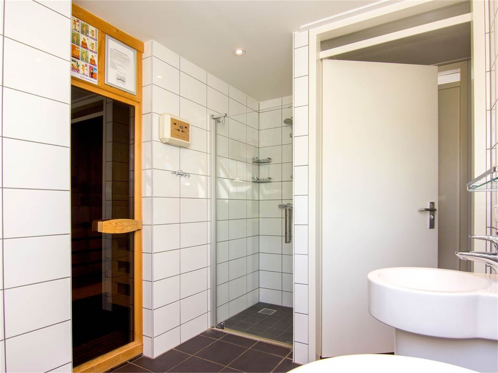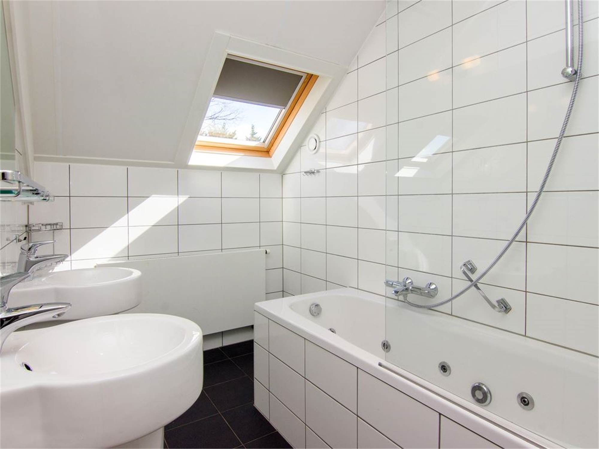 Bathroom with shower cubicle, double washbasin and toilet on the first floor