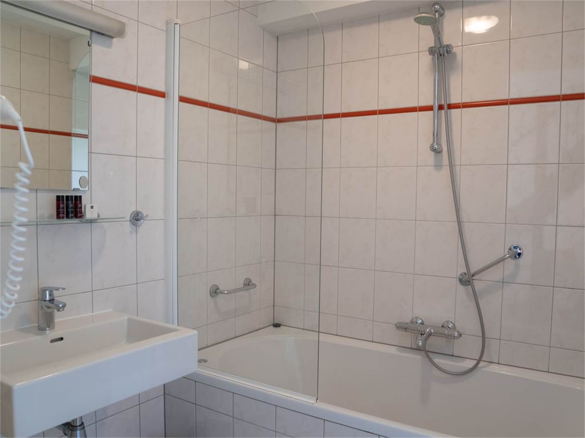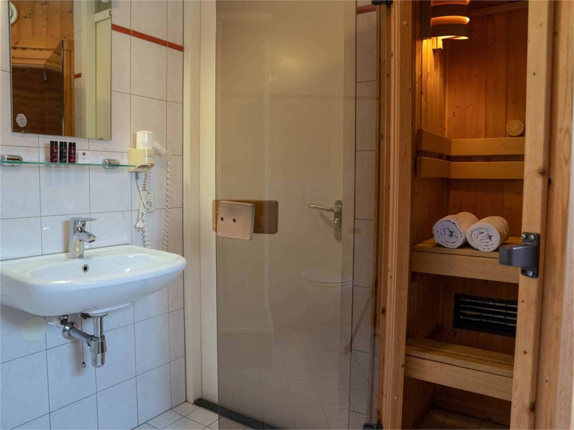 Bathroom with shower cubicle, double washbasin and toilet on the first floor