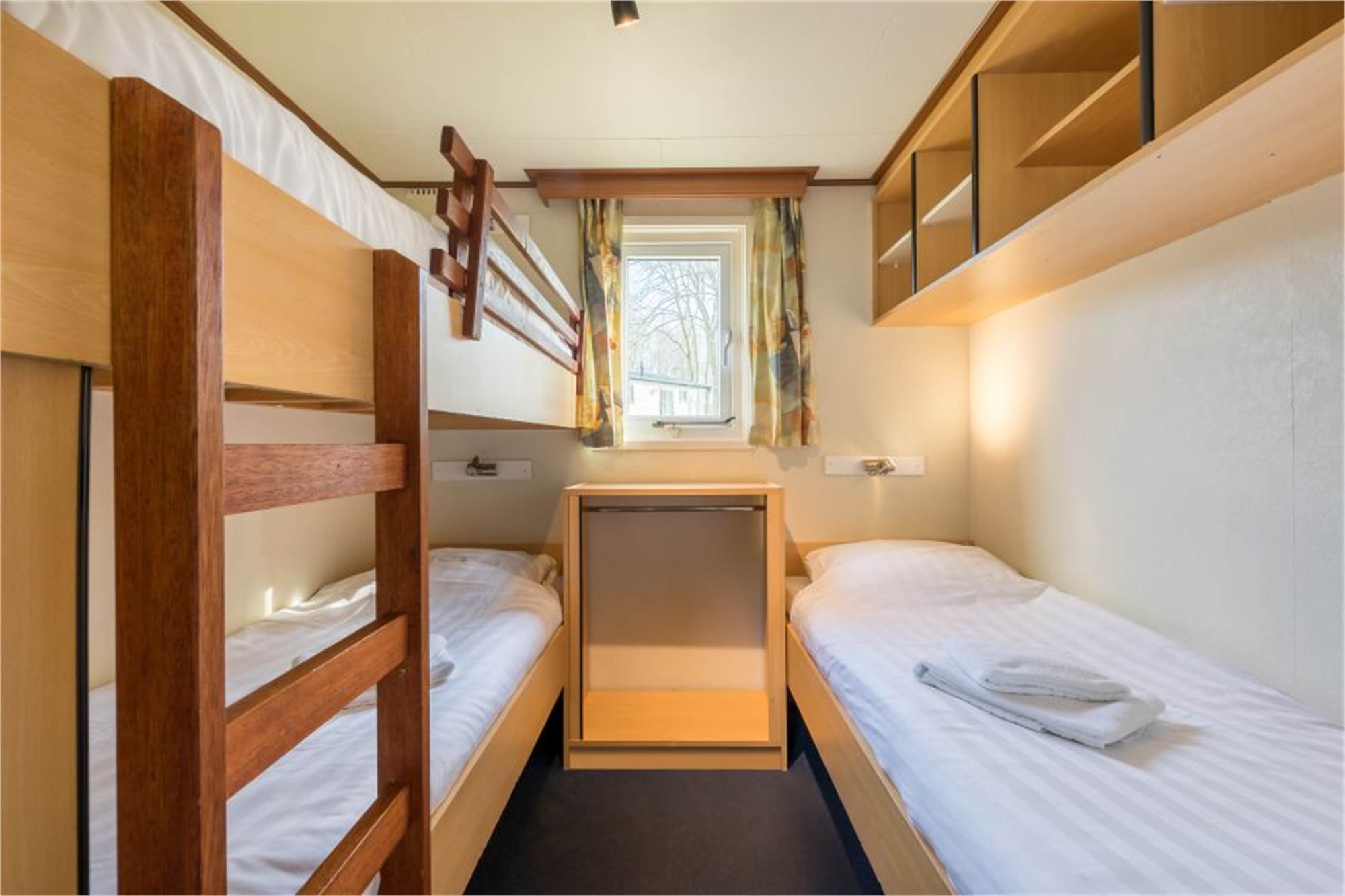 This detached chalet is one-level and suitable for 5 persons. The chalet has a living room with television and an open kitchen with microwave, fridge and coffee machine. There are 2 bedrooms, 1 of which with 2 single beds and 1 with a bunkbed and 1 single bed. The chalet has a bathroom with shower and toilet, and is in addition provided with a furnished terrace. A car park is near the accommodation and use of Wi-Fi is free of charge.
