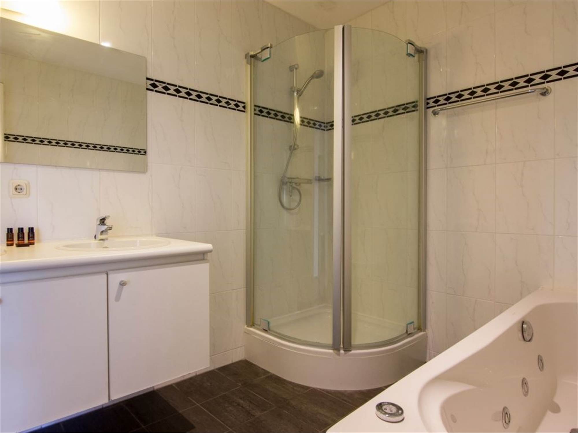 Bathroom with jacuzzi bathtub, shower cubicle and double washbasin