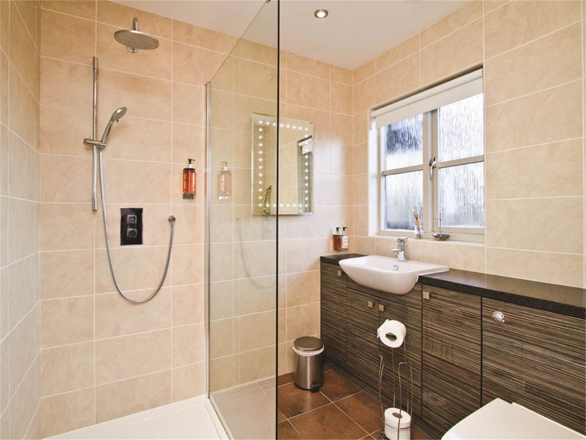 Bathroom with jacuzzi bathtub, walk-in shower, washbasin and toilet