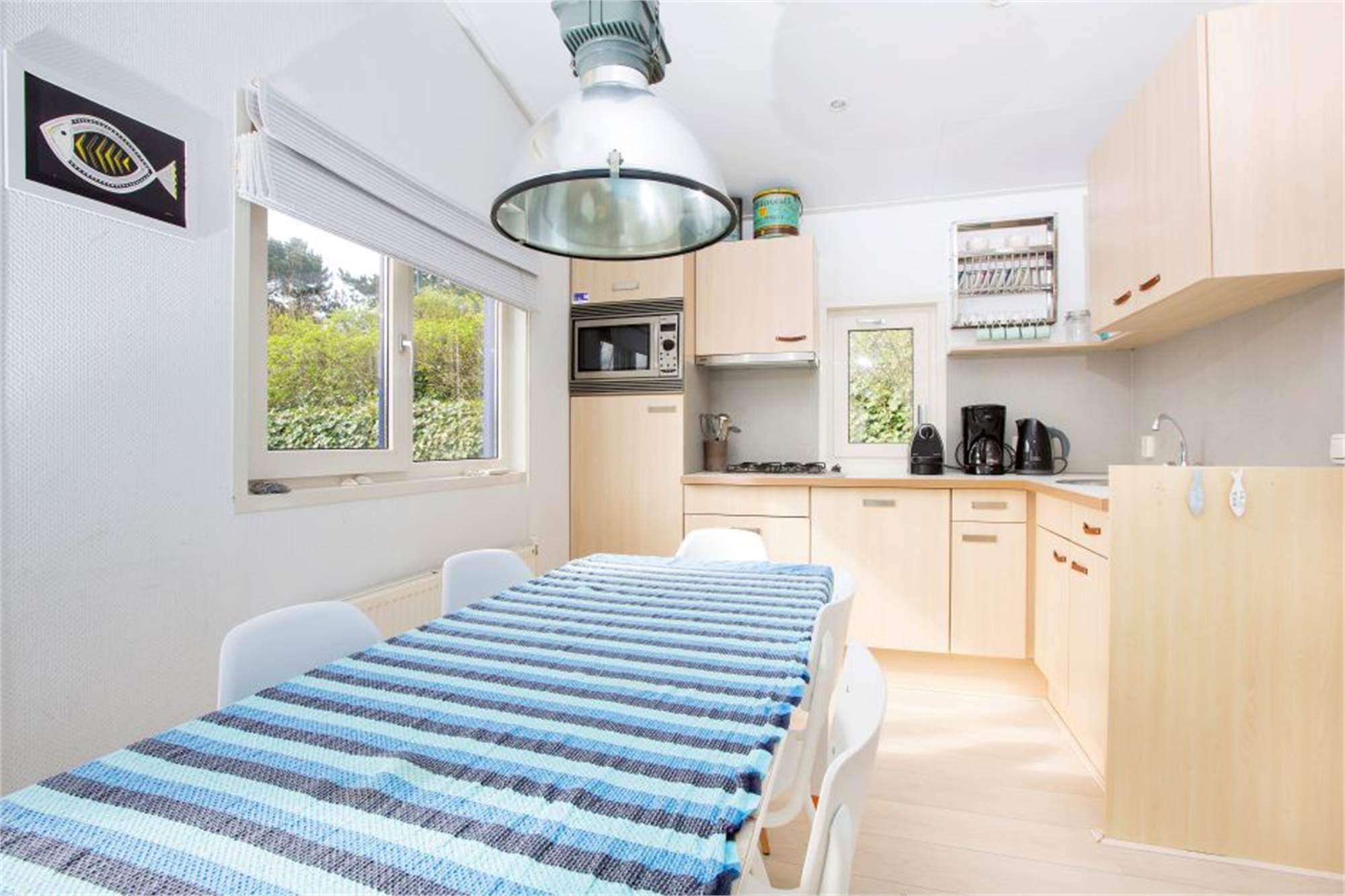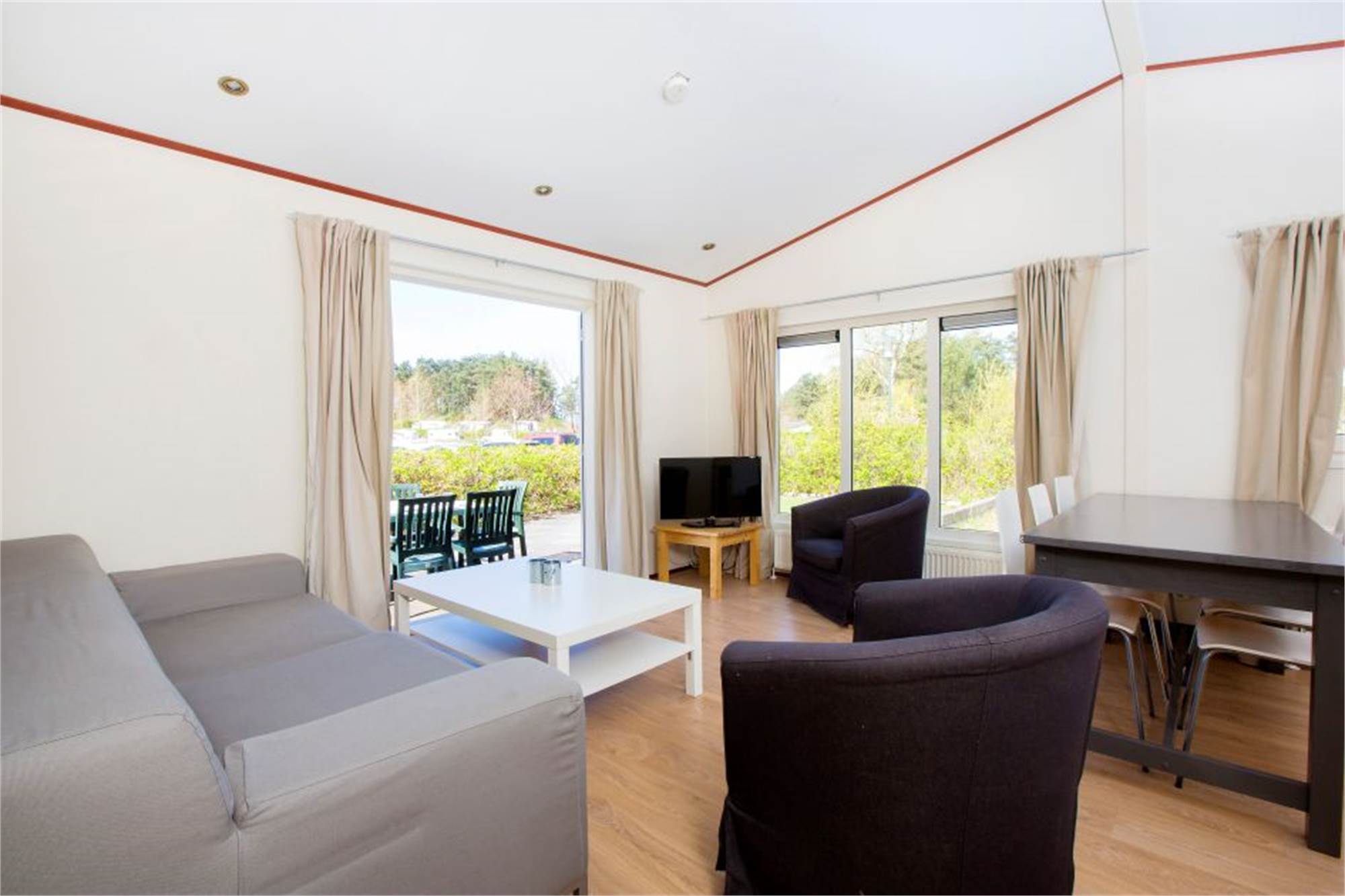 This detached chalet is suitable for six people. Downstairs are a living room with a dining area and an open plan kitchen with a dishwasher and combination microwave oven. There are three bedrooms and a bathroom equipped with a shower and washbasin. There is also a separate toilet. French doors open from the living room directly onto a furnished patio. Wi-Fi is also available to you free of charge.