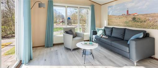 Chalet, suitable for 4 persons. Layout: living room, kitchen with smart TV, bathroom with shower, separate toilet and 2 bedrooms, each with 2 single box spring beds.