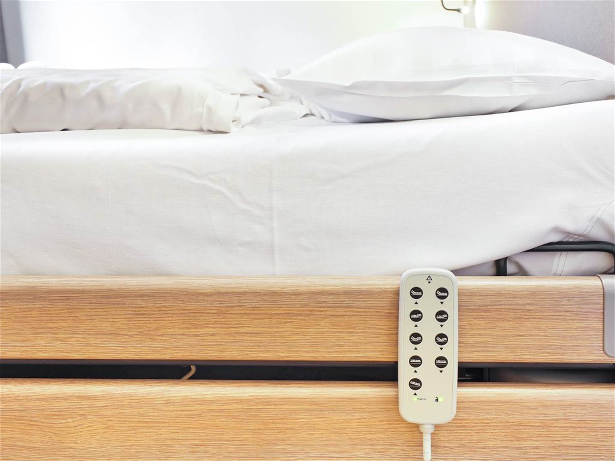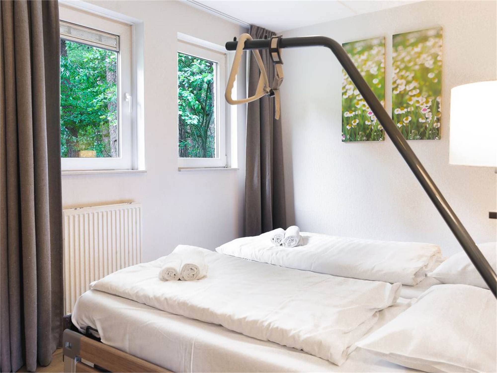 Adapted bedroom with high-low bed and single box spring bed, monkey pole on the wall, space next to the bed a minimum of 90 cm and turning circle a minimum of 100 cm