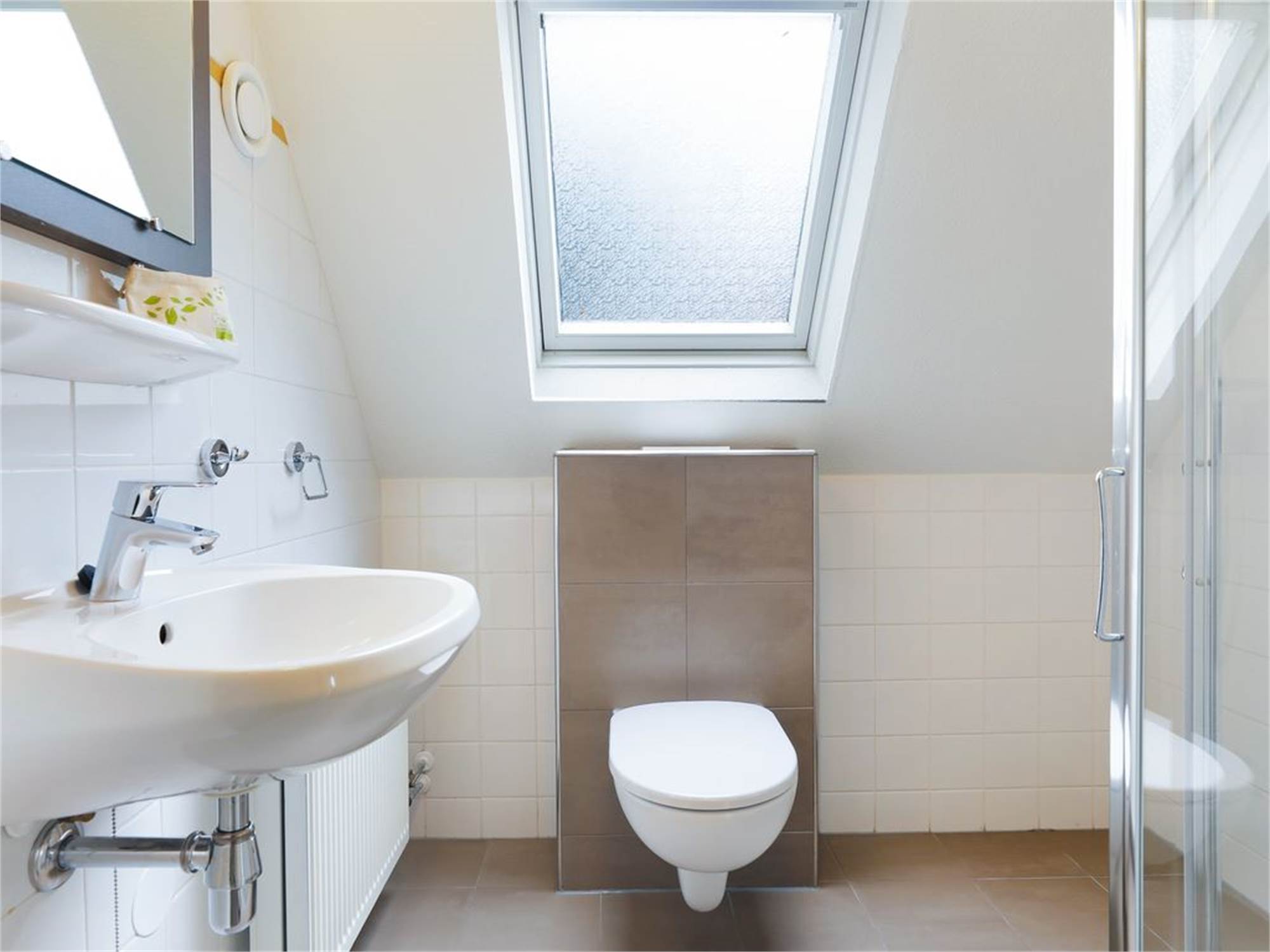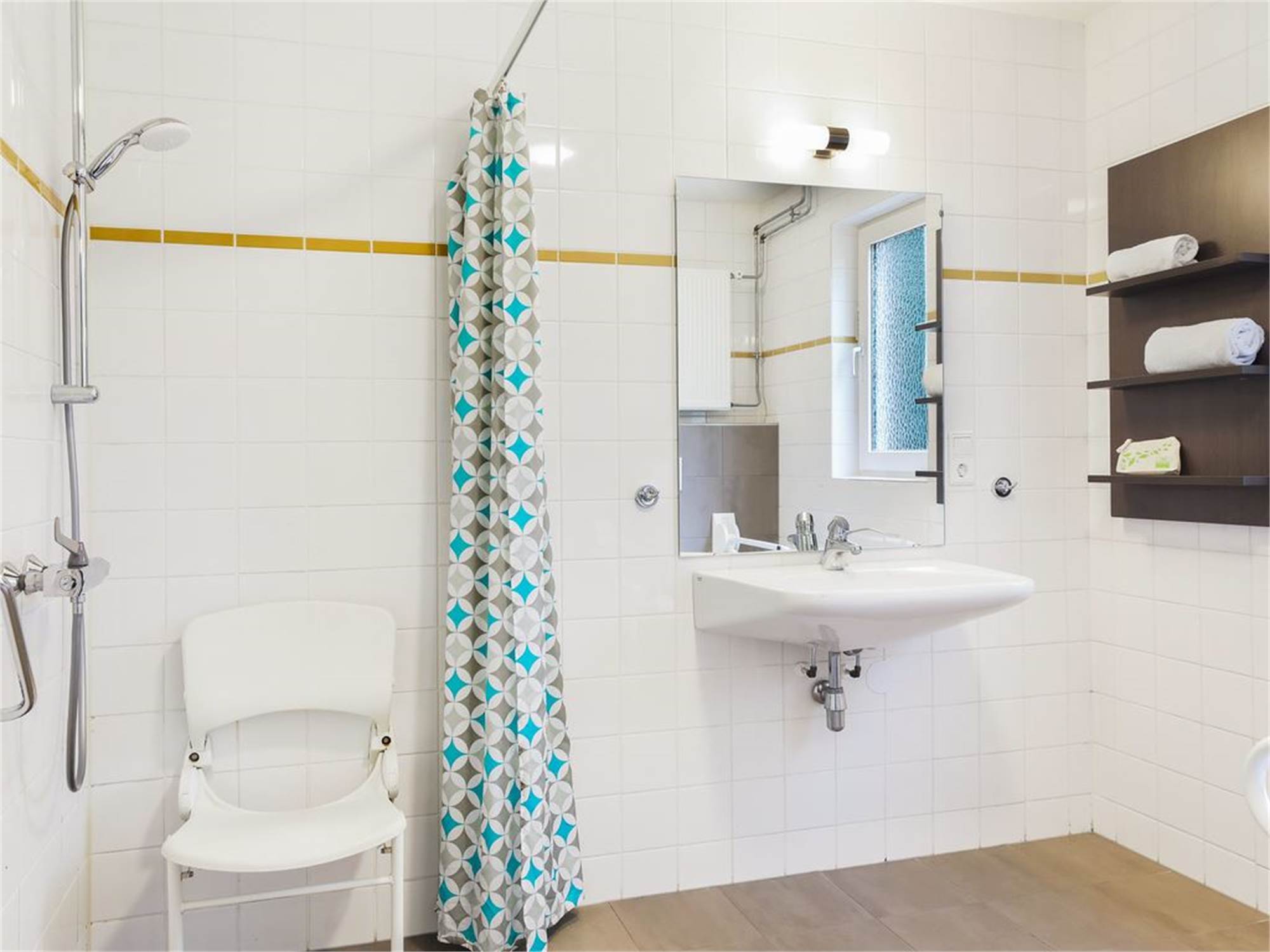 Adapted bathroom with shower cubicle, shower seat without armrest, adjustable mirror, washbasin a minimum of 78 cm high and wheelchair-friendly, single lever mixer taps, raised toilet with grab rails and turning circle a minimum of 150 cm