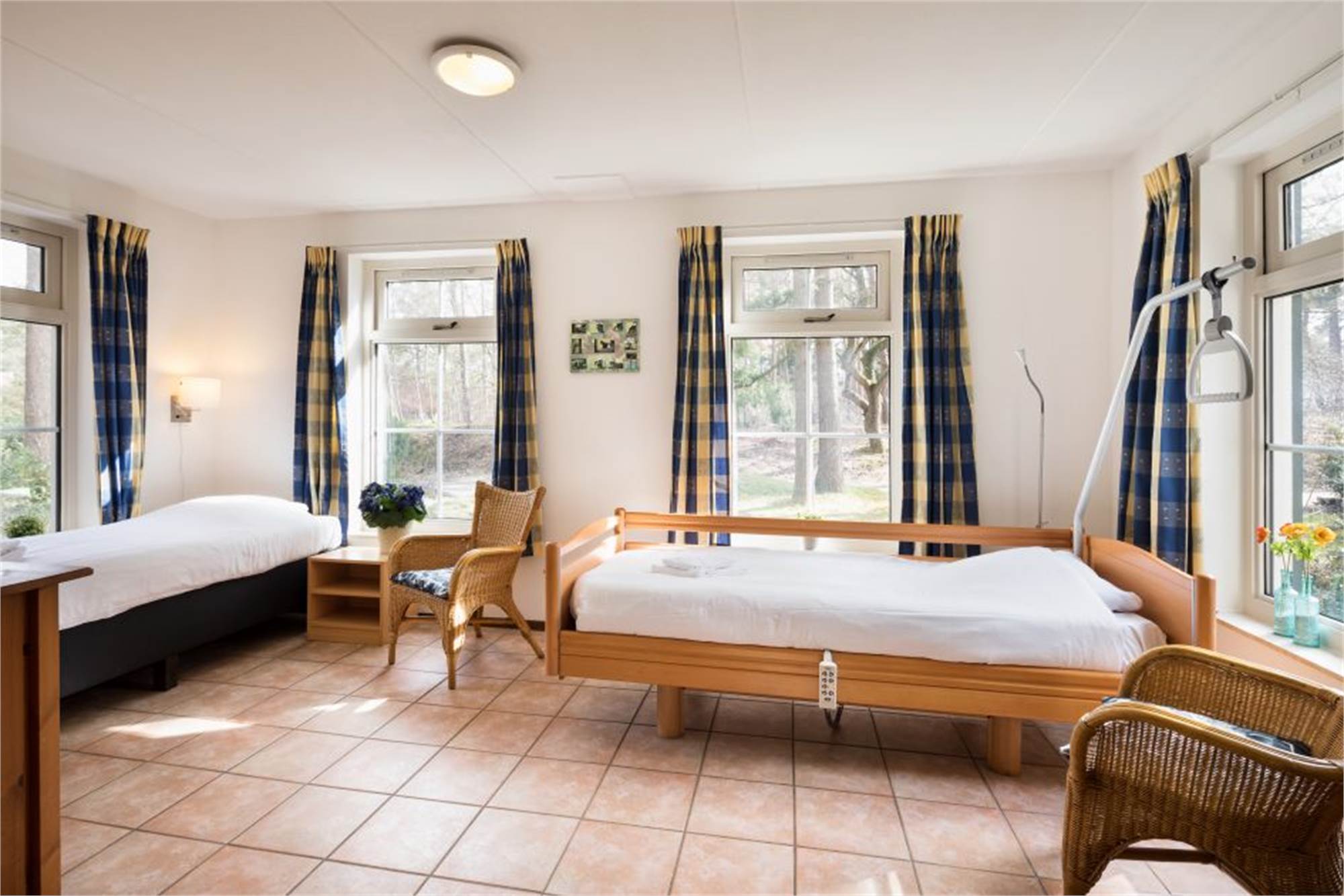 Ground floor: entrance with hallway and toilet. Fully wheelchair-accessible ground floor. Spacious living room with living and dining area, and features including an electrically adjustable luxury easy chair, CD player and DVD player. Open-plan kitchen equipped with refrigerator with coffee machine, combination microwave and dishwasher. Bedroom with electrically adjustable bed with lifting pole and gates and electric alarm connected to bedrooms on first floor. Bathroom with washbasin and shower with separate bedpan/shower chair and toilet with hand grips. Terrace with garden furniture. Separate storage room. The accommodation features a washing machine.